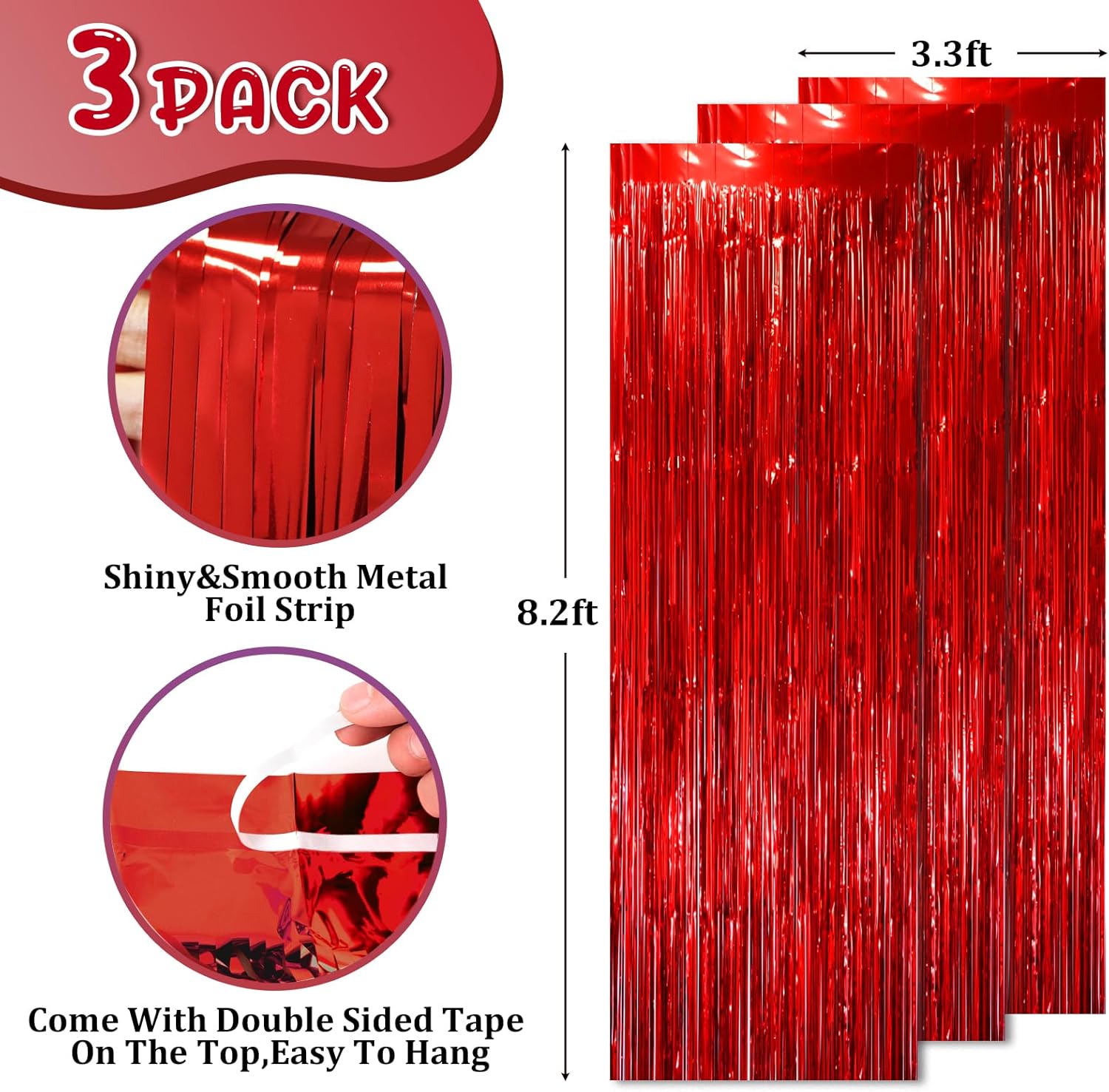 3 Pack 3.3x8.2 Feet Red Foil Fringe Backdrop Curtains, Tinsel Streamers Birthday Party Decorations, Fringe Backdrop for Graduation, Baby Shower, Gender Reveal, Disco Party