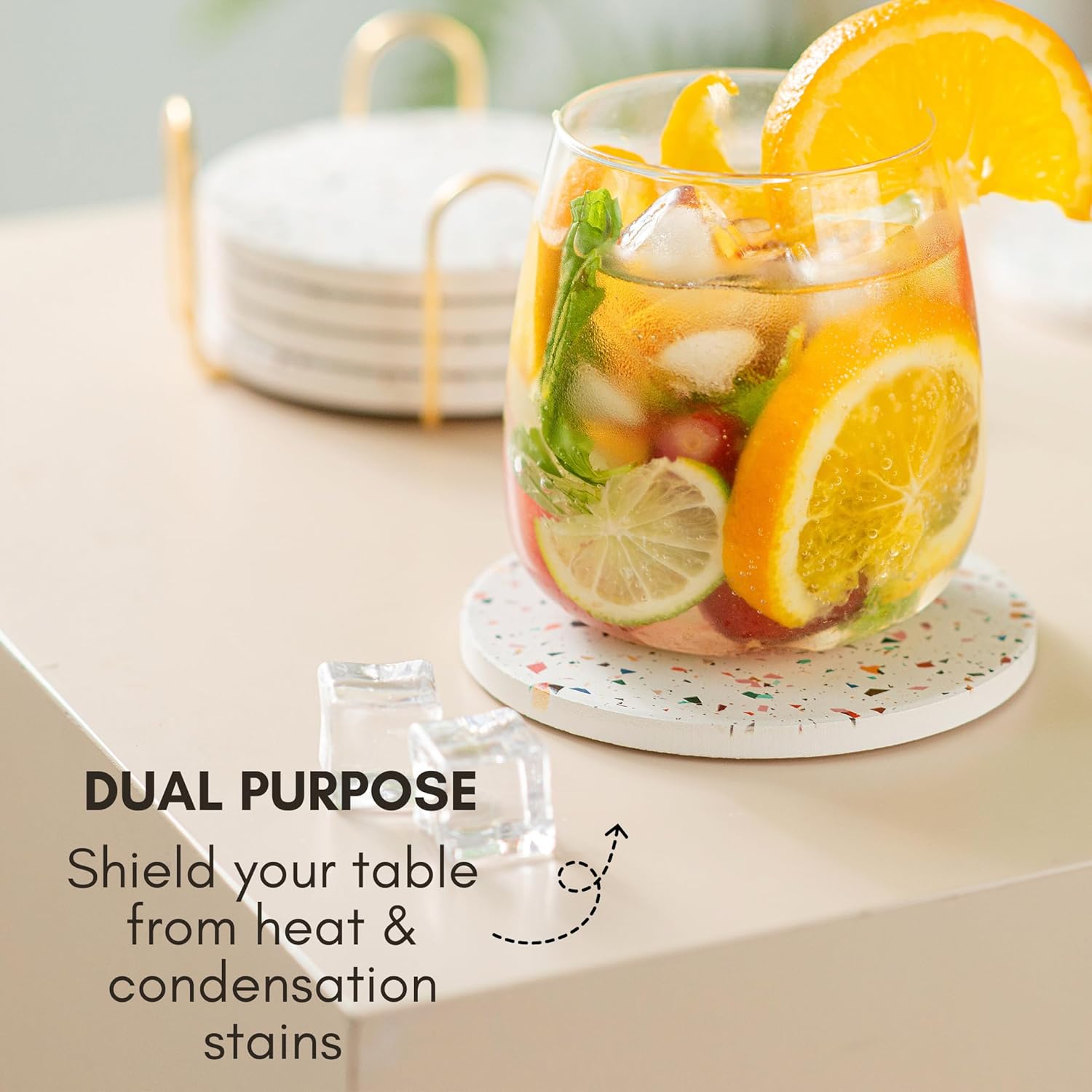 Terrazzo Drink Absorbent Coasters with Holder Set of 6, Ceramic Coaster for Drinks, Coffee Table Decor, Water Absorbing Stone Coaster for Drinks (Confetti)