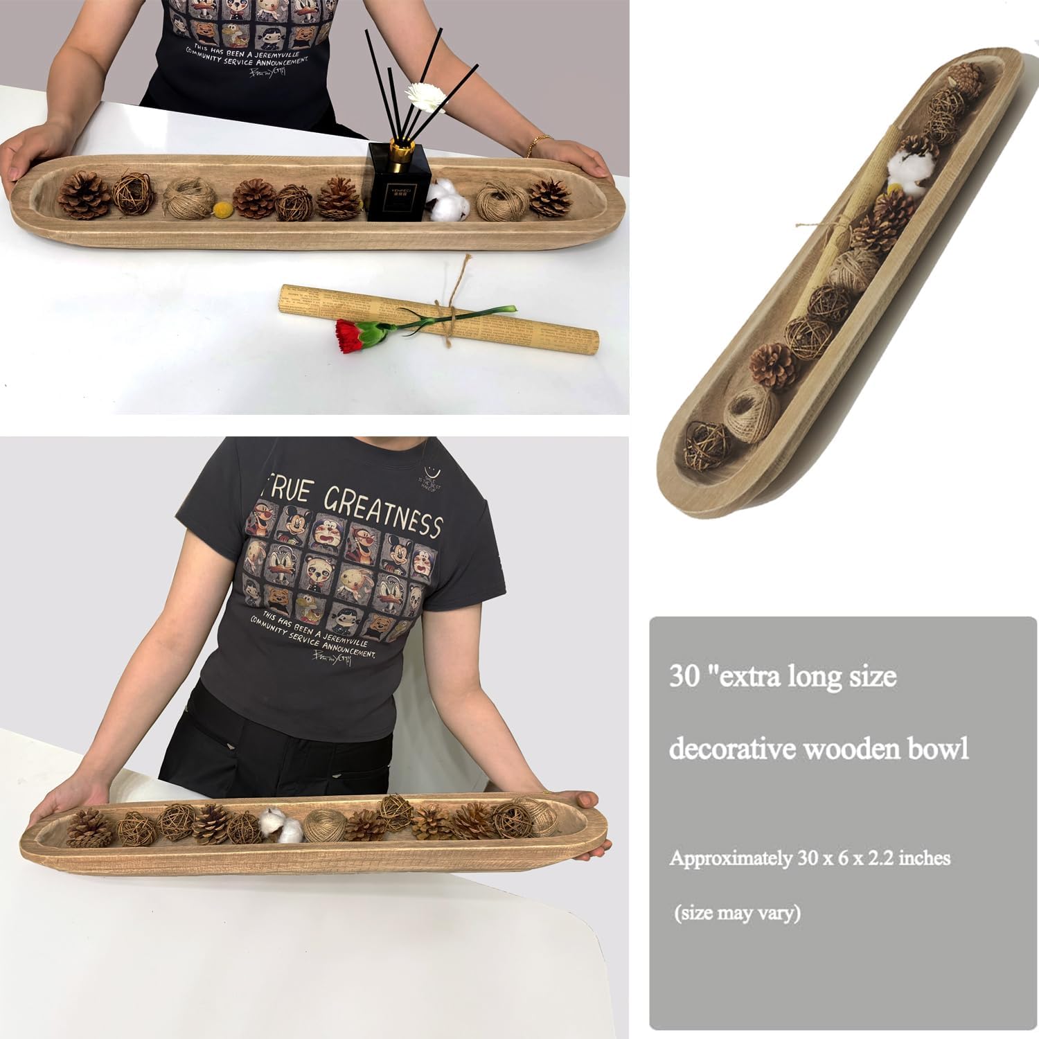 - Multi functional wooden noodle bowl : Multi functional decoration and use. Large noodle bowls of various lengths can accommodate a large amount of items in any season. This wooden noodle bowl is a perfect supplement to the decoration of your home, restaurant, living room, or farmhouse. It can also store daily small items such as keys, watches, mobile phones, etc. It can also be given as gifts to friends, classmates, and relatives.