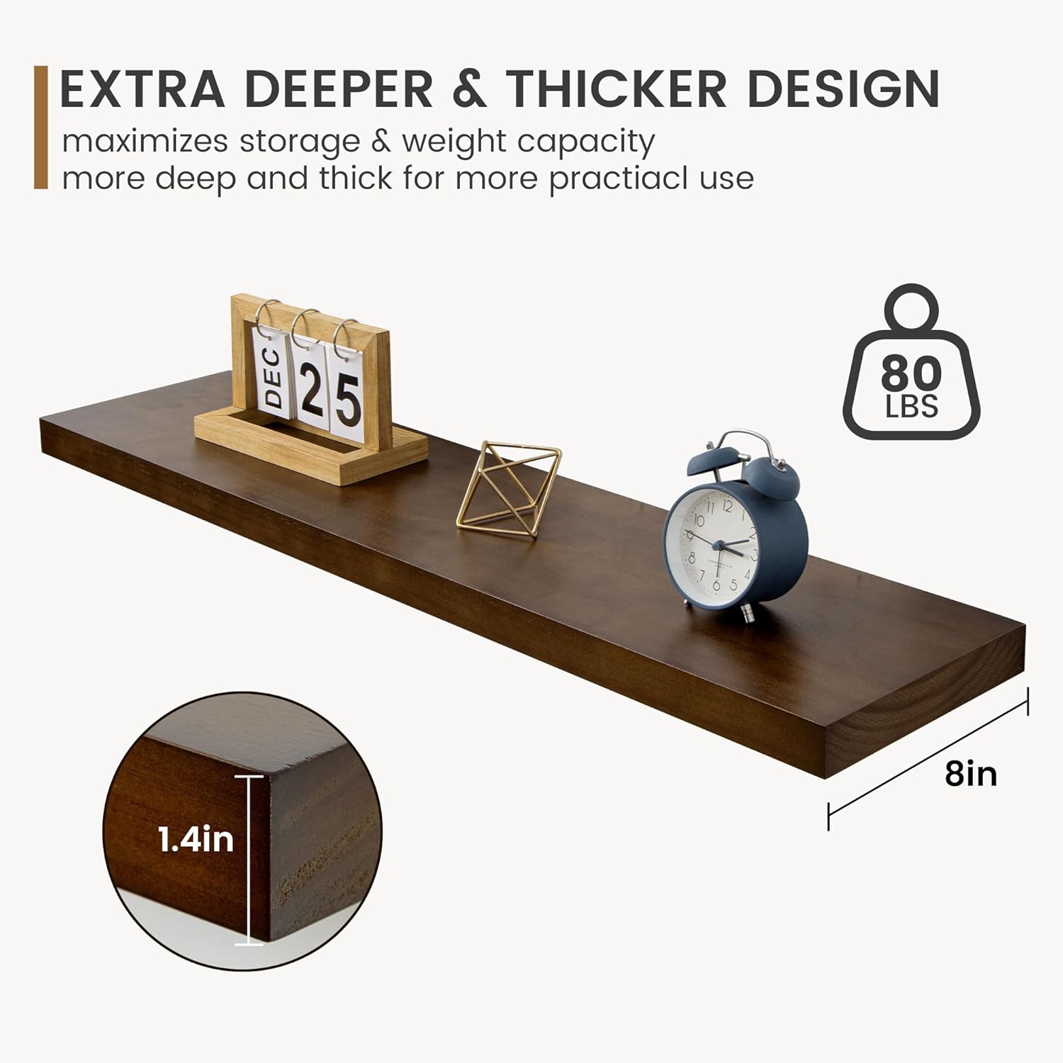 - Extra Deeper & Thicker for Storage - Each board measures 36"W x 8"D x 1.4"H. Extra deeper and thicker design in order to bring maximizes storage space and weight capacity, even hold up to 60 lb. This floating shelf taking up zero square feet, reduces clutter and highlights décor in compact spaces. It can help make full use of the empty wall, making it much more space-saving and making your room look larger and tidier.