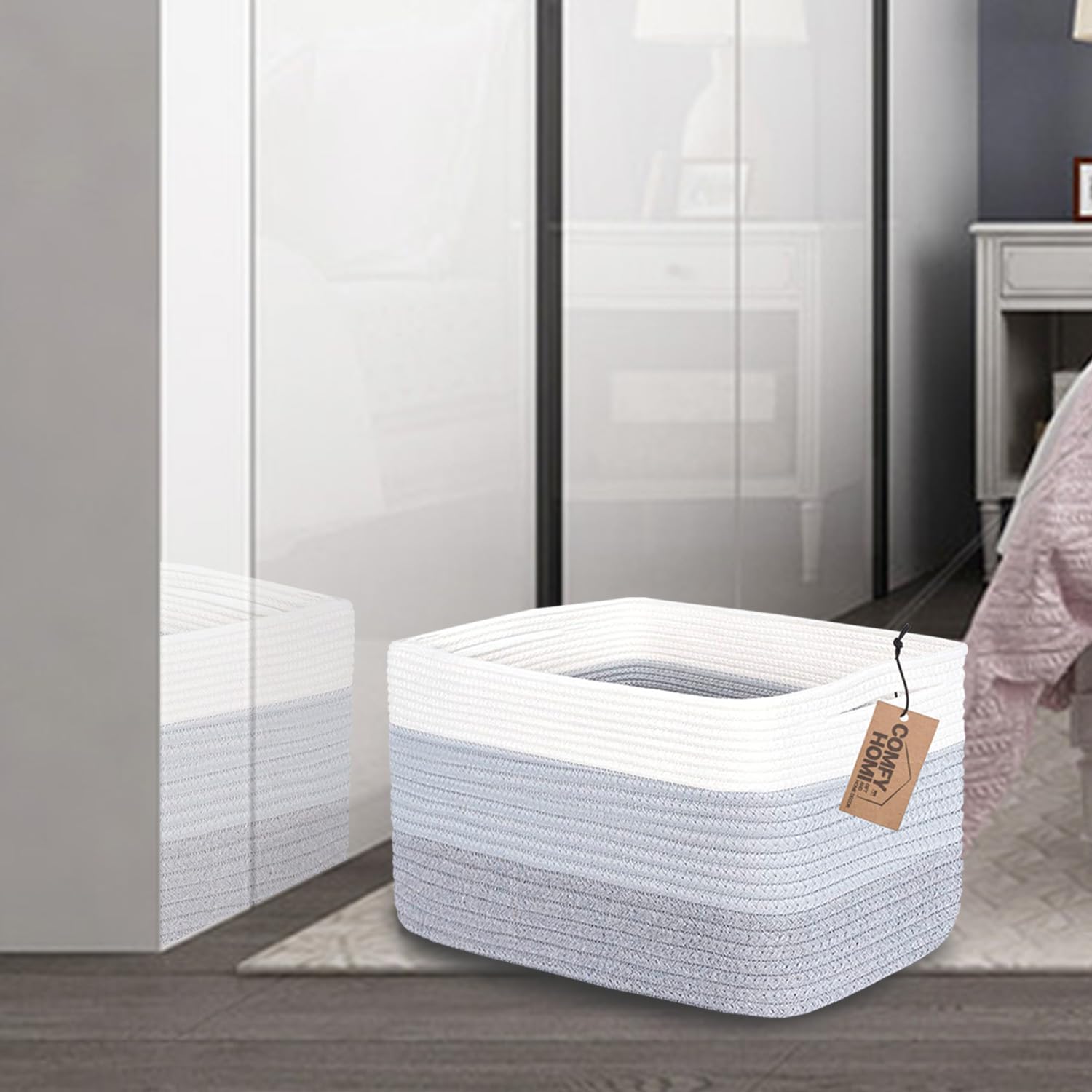 COMFY-HOMI Cotton Rope Woven Basket with Handles for Shelves,Toys,Book, Cloth Storage Baskets Bin for Organizing-13.5"x11"x9.5" Toy Decorative Organizer for Living Room, Bathroom-White/3Tone Grey