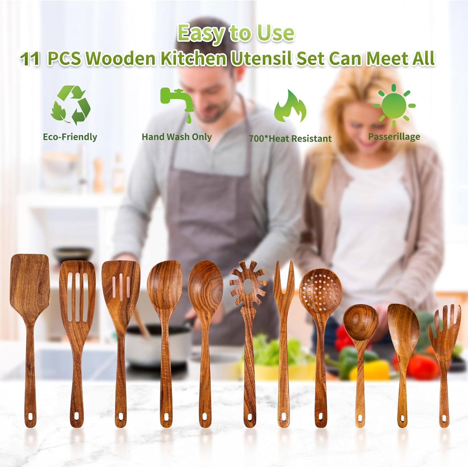 GUDAMAYE 11 PCE Wooden Spoons for Cooking, Wooden Kitchen Utensils Set,Wooden Cooking Utensils,Natural Teak Wooden Spoons For Non-stick Pan
