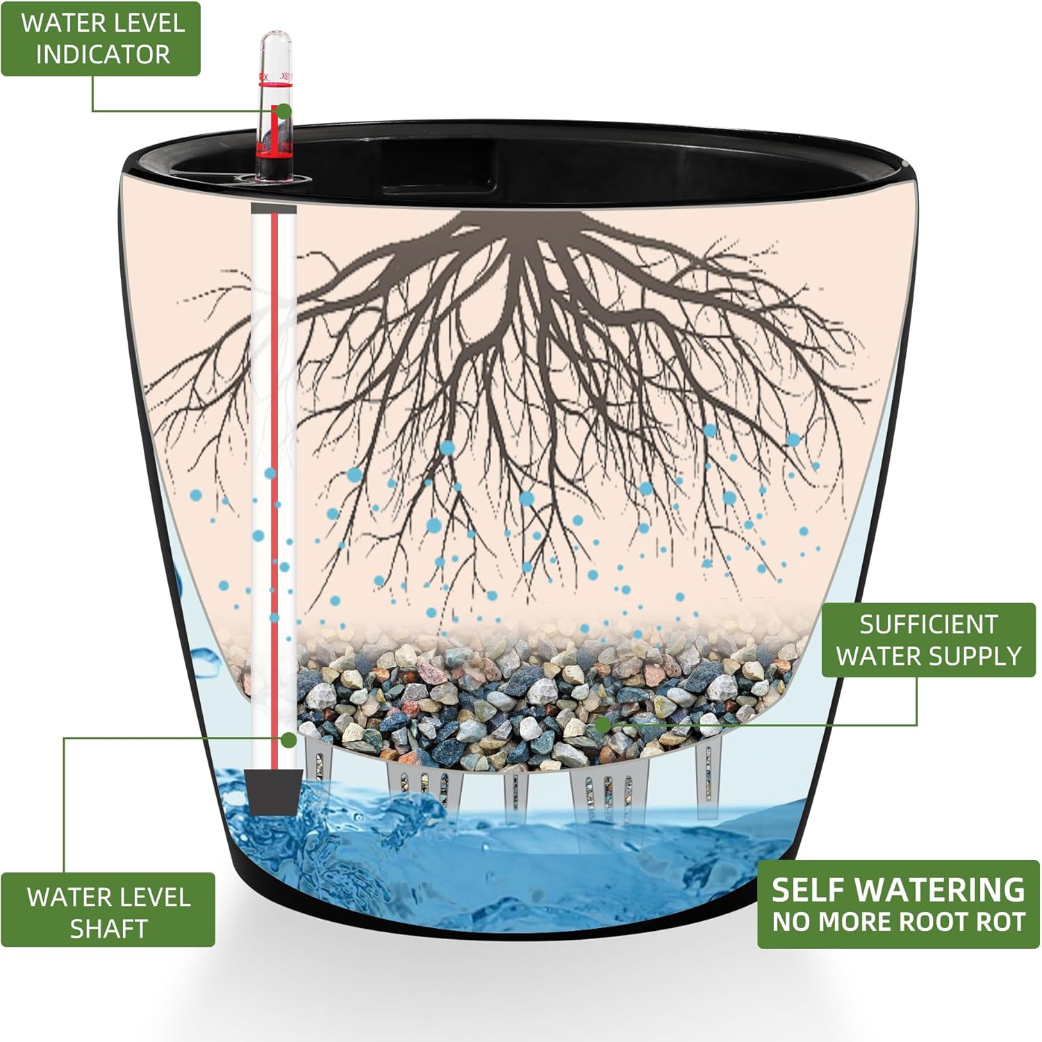 - SELF WATERING & NO MORE ROOT ROT - The smart unique sub-irrigation system is one of the most appealing aspects among all Dexceder planters. The easy-to-use separated integrated water reservoir or catcher- keeps your soil well aerated and automatic supplies plants with the right amount of ongoing moist air & nutrition for optimal growth. The insert indicator shows you the exact time to water again. The full water supply period can single-handedly last over 3 weeks based on different live plants