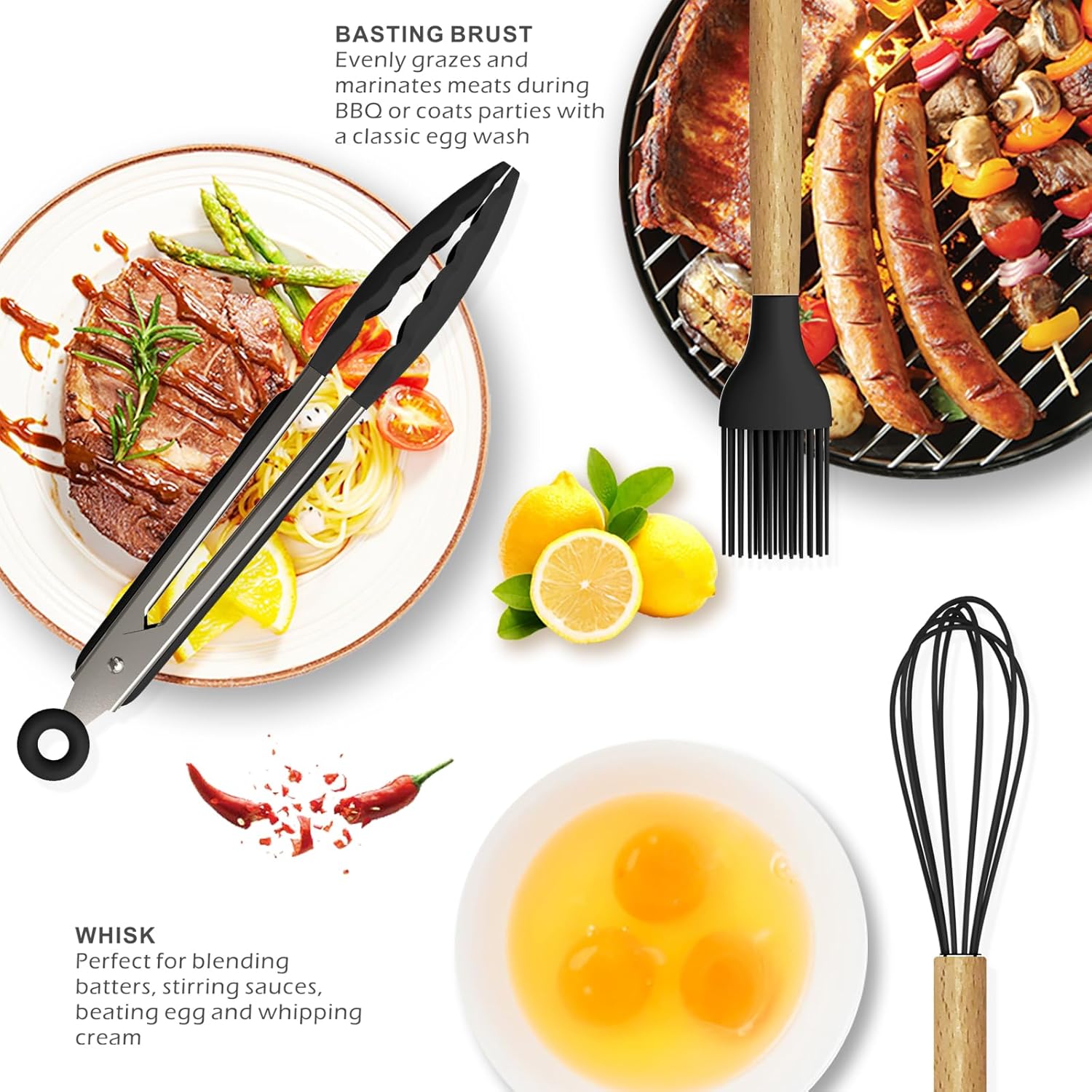 Silicone Cooking Utensils Set - 446°F Heat Resistant Silicone Kitchen Utensils for Cooking,Kitchen Utensil Spatula Set w Wooden Handles and Holder, BPA FREE Gadgets for Non-Stick Cookware (Black)