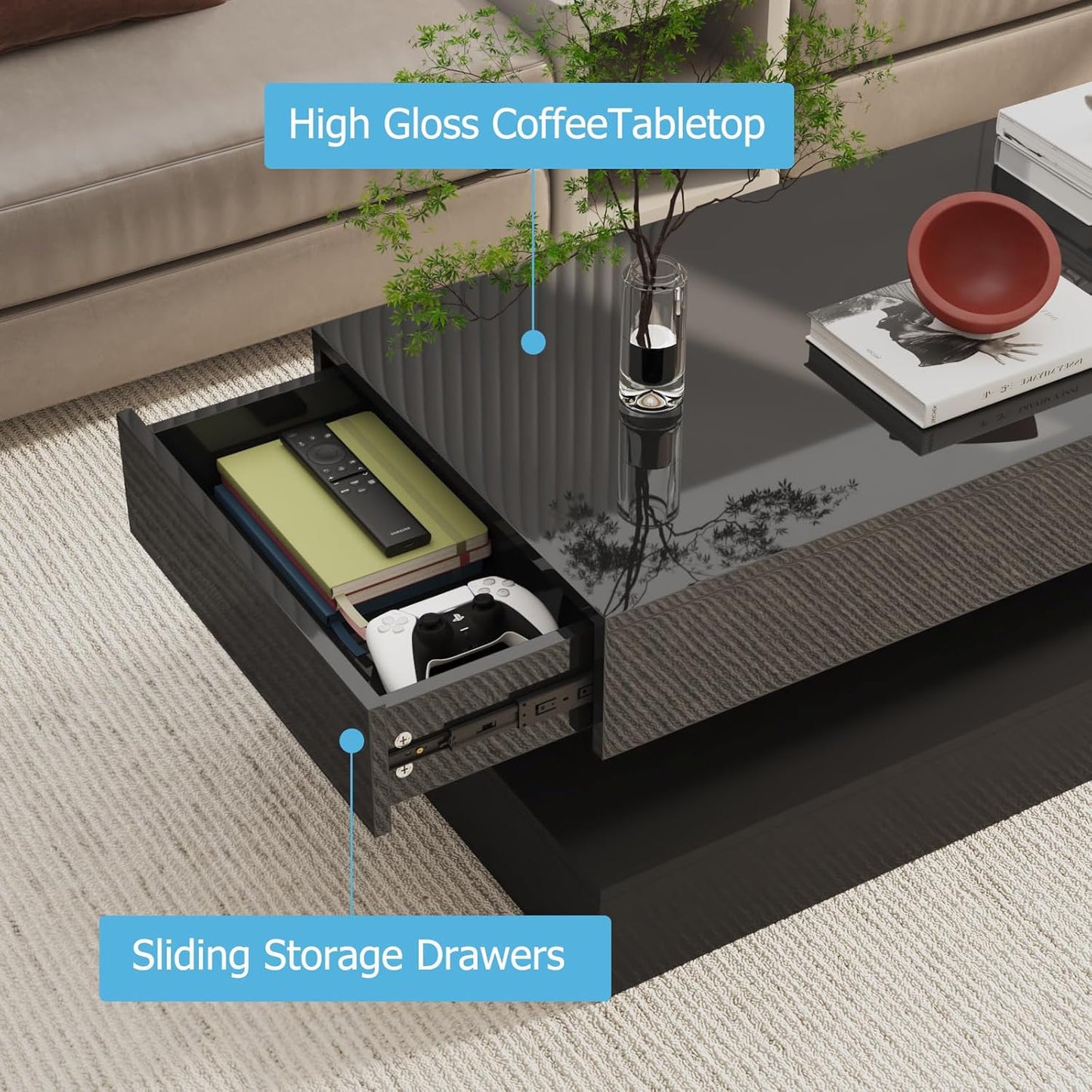 - Modern Coffee Table :The LED High Glossy Coffee Table.Modern Coffee Table can match any style of room decoration, and is very suitable for farmhouses, living rooms, bedrooms and offices.
