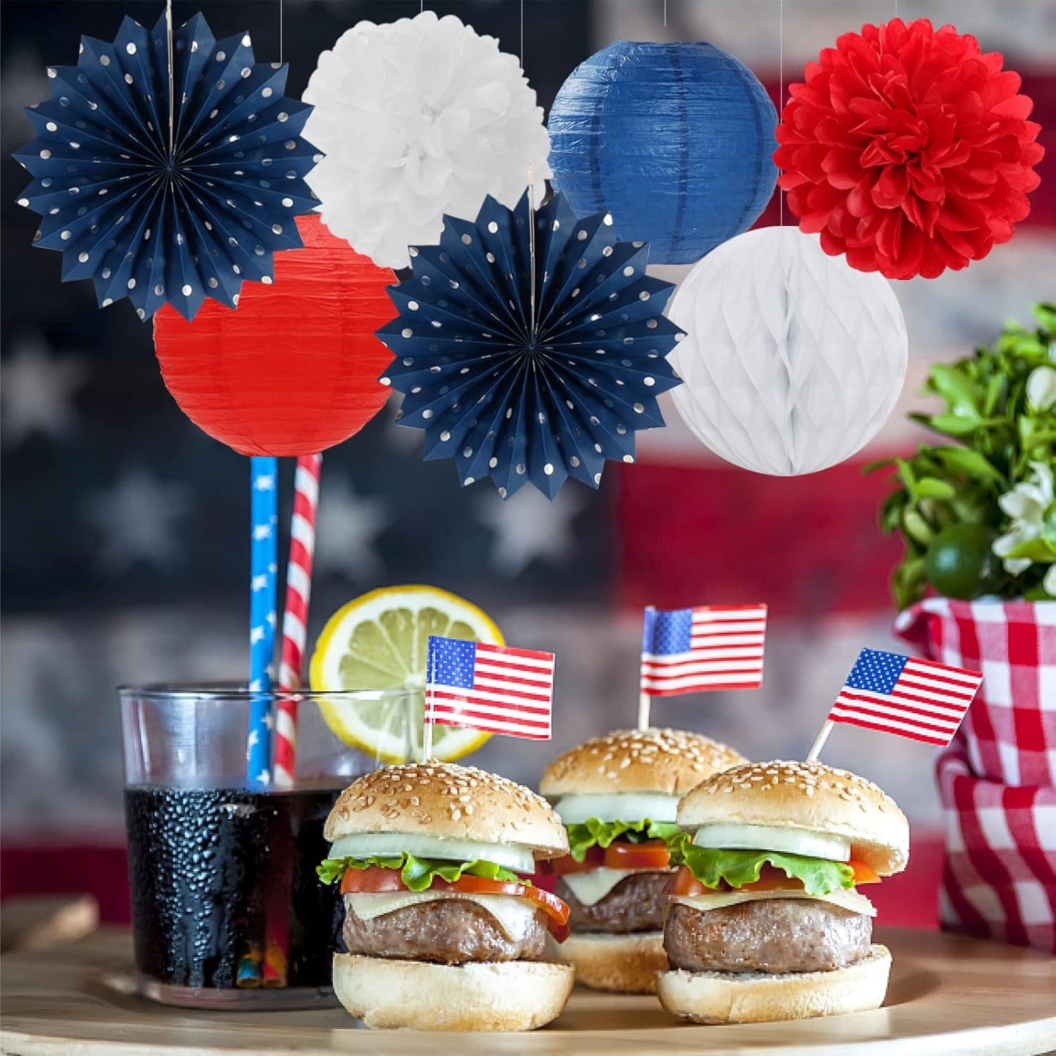 - 【Package Contains】The red white blue party kits include 6pcs tissue paper flowers: 3pcs 10" and 3pcs 12" in three color, 4pcs 8inch paper honeycom ball,2pcs 8inch paper lantern, 2pcs 12inch paper fan.