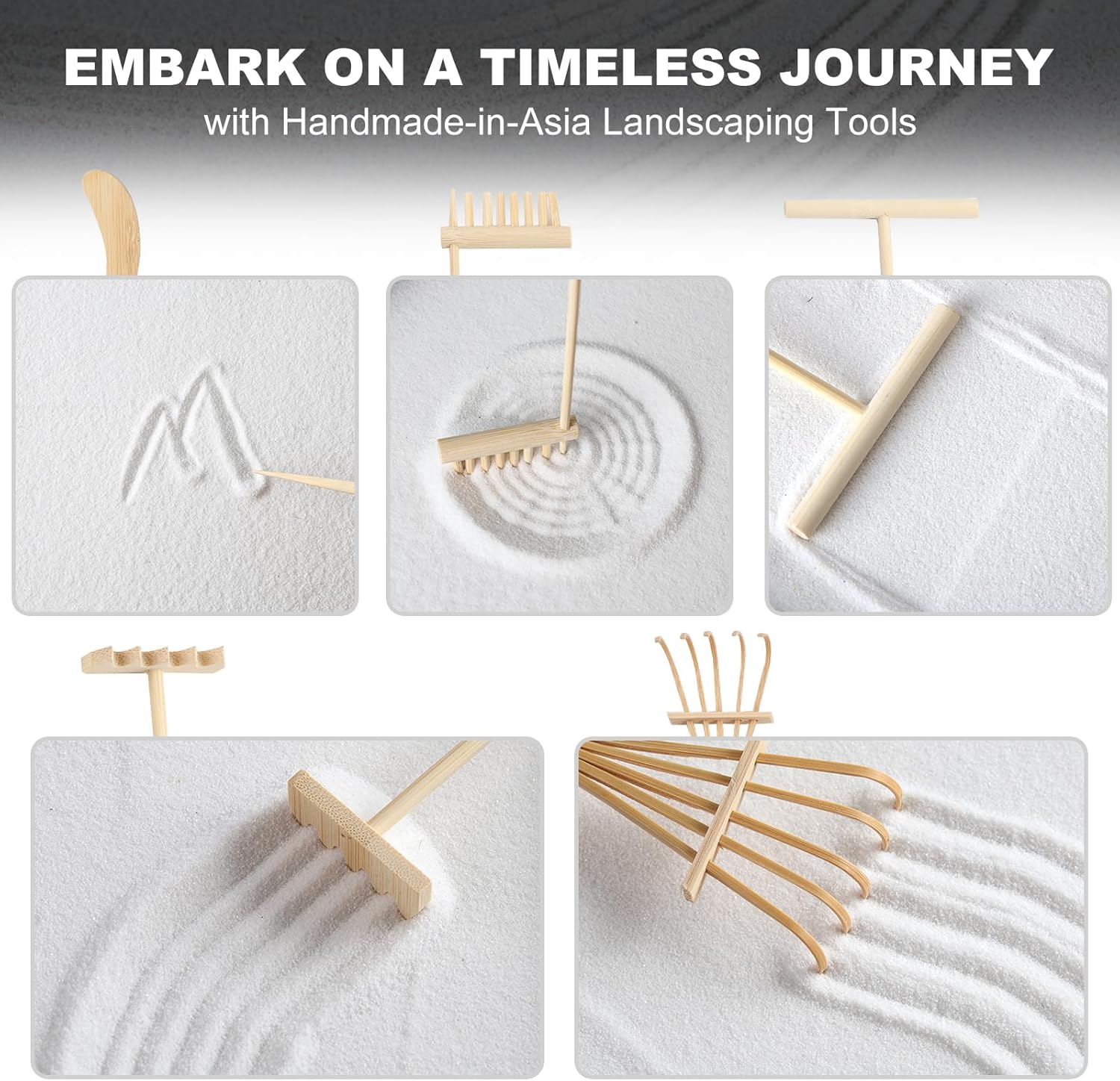 - 🌳【HIGH QUALITY MATERIALS】 - Our premium miniature zen garden decor kit are made of safe and durable materials, the wooden tray and garden tools are made of MDF board with smooth surface; white sand is quartz sand, hard and wear-resistant, zen rocks are real stones matches the plants, flowers and bridge which are made of durable polyresin material and expertly crafted for the entirely realistic look and utilization; Create a more natural beauty zen decor and to be proudly displayed anywhere.