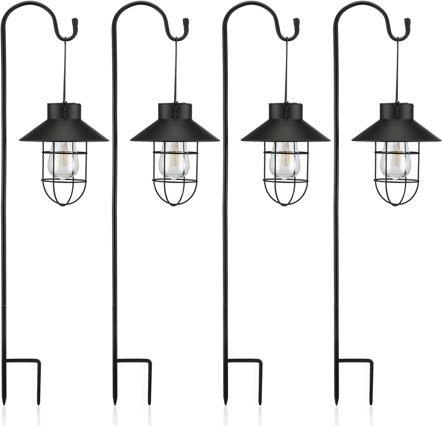- Outdoor Decorative Solar Lantern Lights: you will receive 4 packs hanging decorative wall lanterns and 4 pieces 31 inches shepherd hooks, with 360 degree lighting angle; These beautifully crafted hanging solar lantern lights feature a retro look with painted iron shell and bright lights that will add a charming ambience for your garden