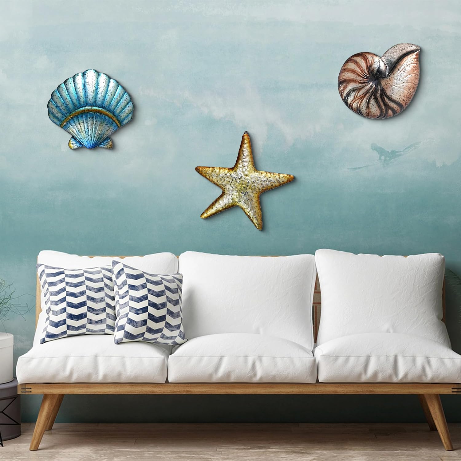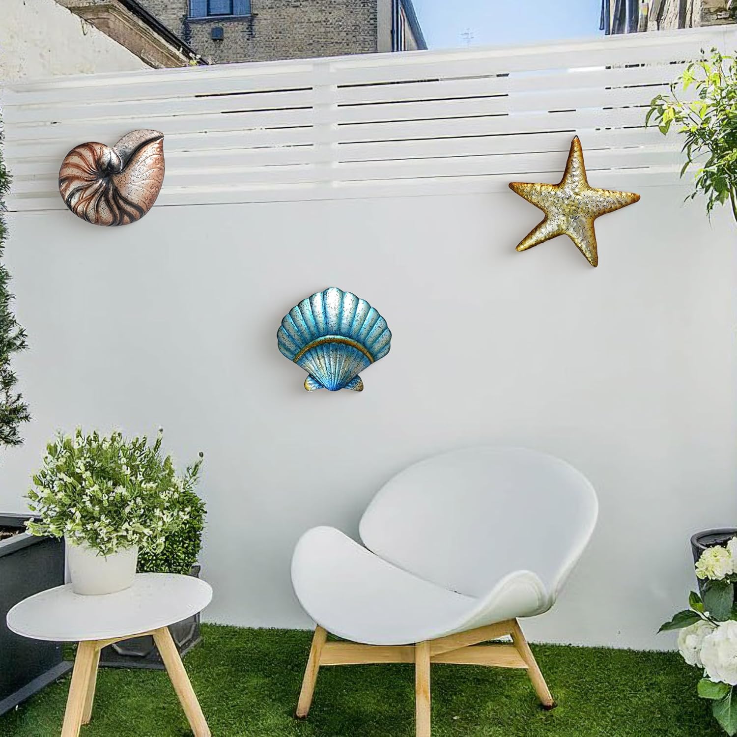 Weibefee 3 Pcs Metal Beach Wall Decor Sea Star Shell Conch Metal Decor Ocean Theme Marine Coastal Bathroom Decorations Rustic Cottage Nautical Wall Art for Office Home Living Room Nursery Room
