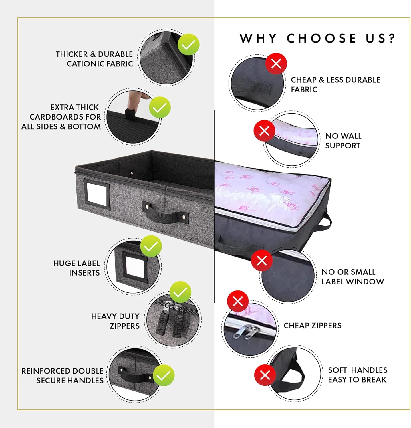 - ๐๐๐๐ฏ๐ฒ ๐๐ฎ๐ญ๐ฒ ๐๐ข๐ฉ๐ฉ๐๐ซ ๐๐ฅ๐จ๐ฌ๐ฎ๐ซ๐: Committed to safety and organization, our under bed flat storage boxes are precisely tailored. The zipper of our storage containers for under the bed ensures that the items inside are protected from dust and other elements that can cause damage. Our under bed storage with lid are pusposely designed with durability and strength making it ideal for flat clothing storage that require frequent opening and closing, or those that carry heavy loads.