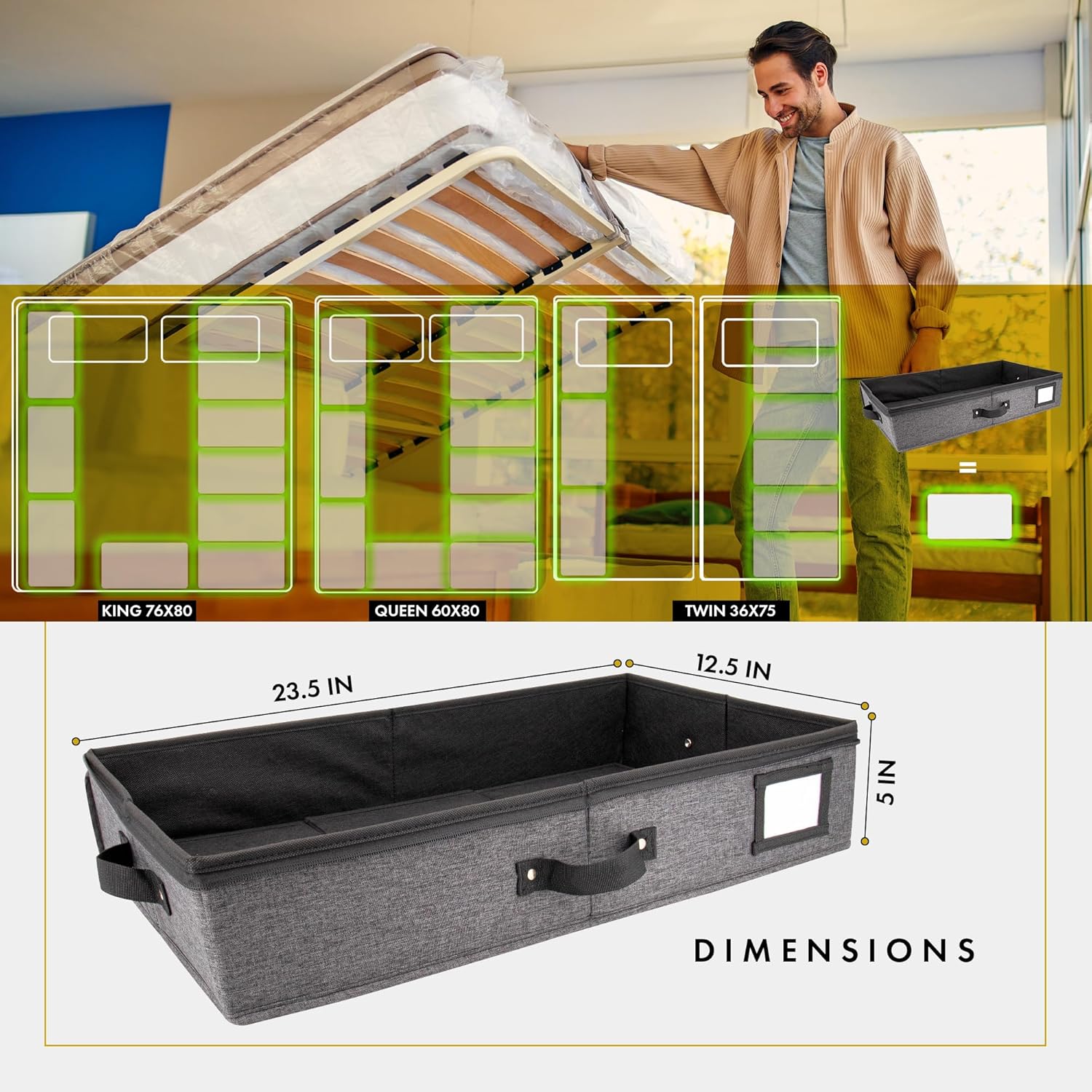 - ๐๐๐๐ ๐๐๐ญ๐ข๐จ๐ง๐ข๐ ๐๐ฅ๐จ๐ญ๐ก ๐๐๐ญ๐๐ซ๐ข๐๐ฅ: Made from premium quality fabric, our 23.5x12.5x5" Under Bed Storage Containers With Lids are durable, sturdy, & carefully designed to hold large quantities of clothes, blankets, shoes, & various bed accessories. These under bed storage dorm drawers are designed to fit perfectly under your bed for efficient bed room organization and storage, making it an under bed organizer that will easily blend into your home's aesthetic style.
