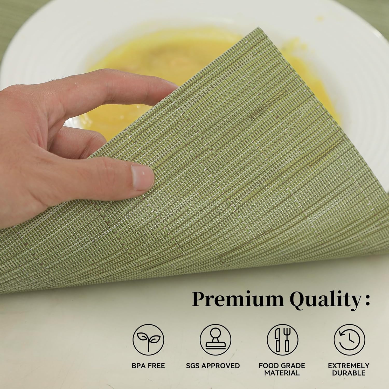 - Premium Quality and Durability: Our placemats are crafted from a superior blend of 70% PVC and 30% Polyester, ensuring exceptional quality and long-lasting durability. Endorsed by SGS certification, they are guaranteed to meet the highest standards.
