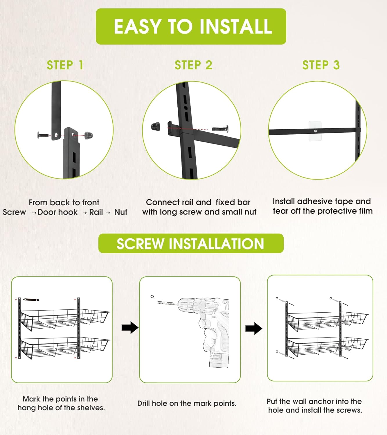 - Adjustable & Wall-Mounted: This over the door pantry organizer can be adjusted to accommodate items of different heights. You can easily nail this rack to your wall or door for a secure and sturdy fit. The rack also features 6 flexible hooks and 4 adhesive stickers, which help to prevent swinging when opening and closing doors. The full basket design also ensures that your items won't slide off the back of the rack.
