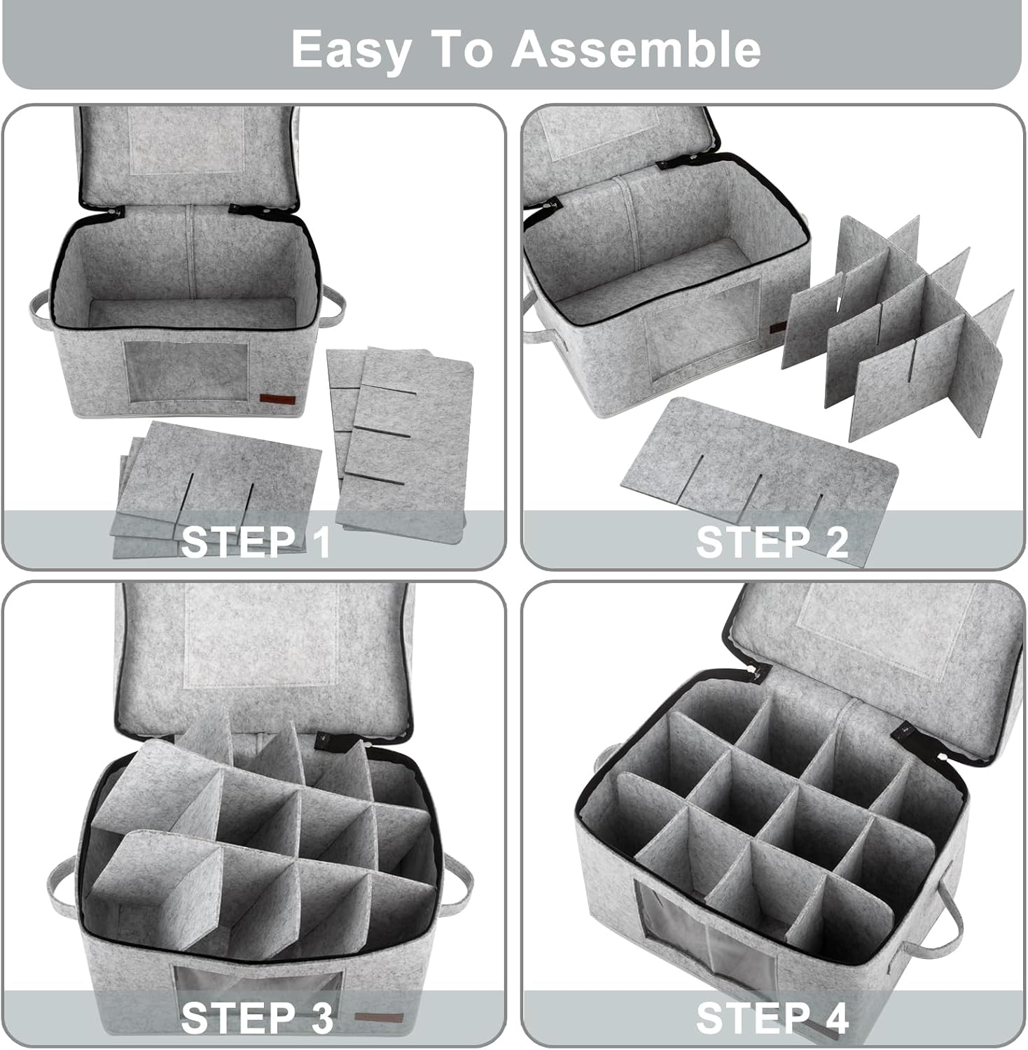 - Easy to Install: These storage container with dividers are collapsible and dismantle, It is easy to install, just assemble the dividers first, then put the into the box, finally completed. At the top of the wine glass storage containers, there is a place where we are preparing for you.