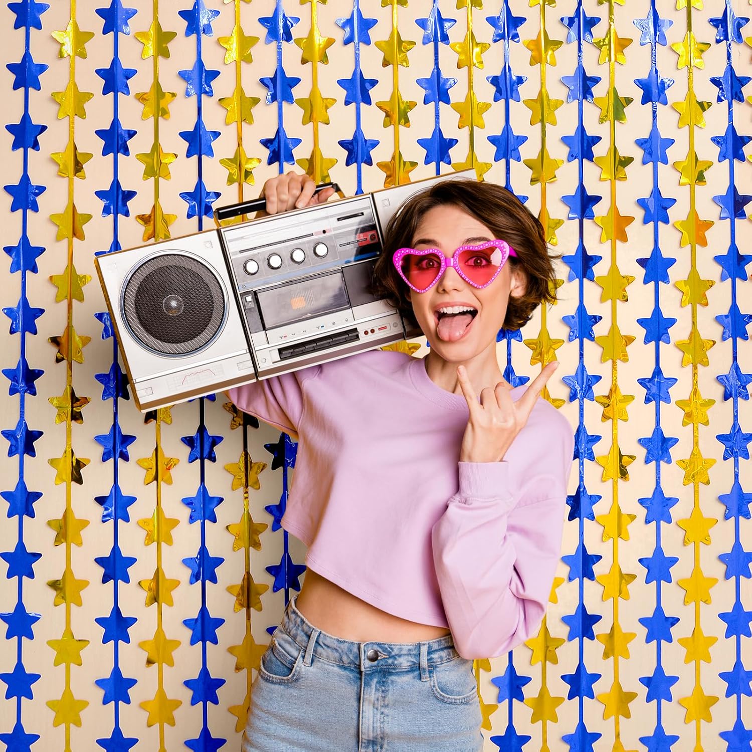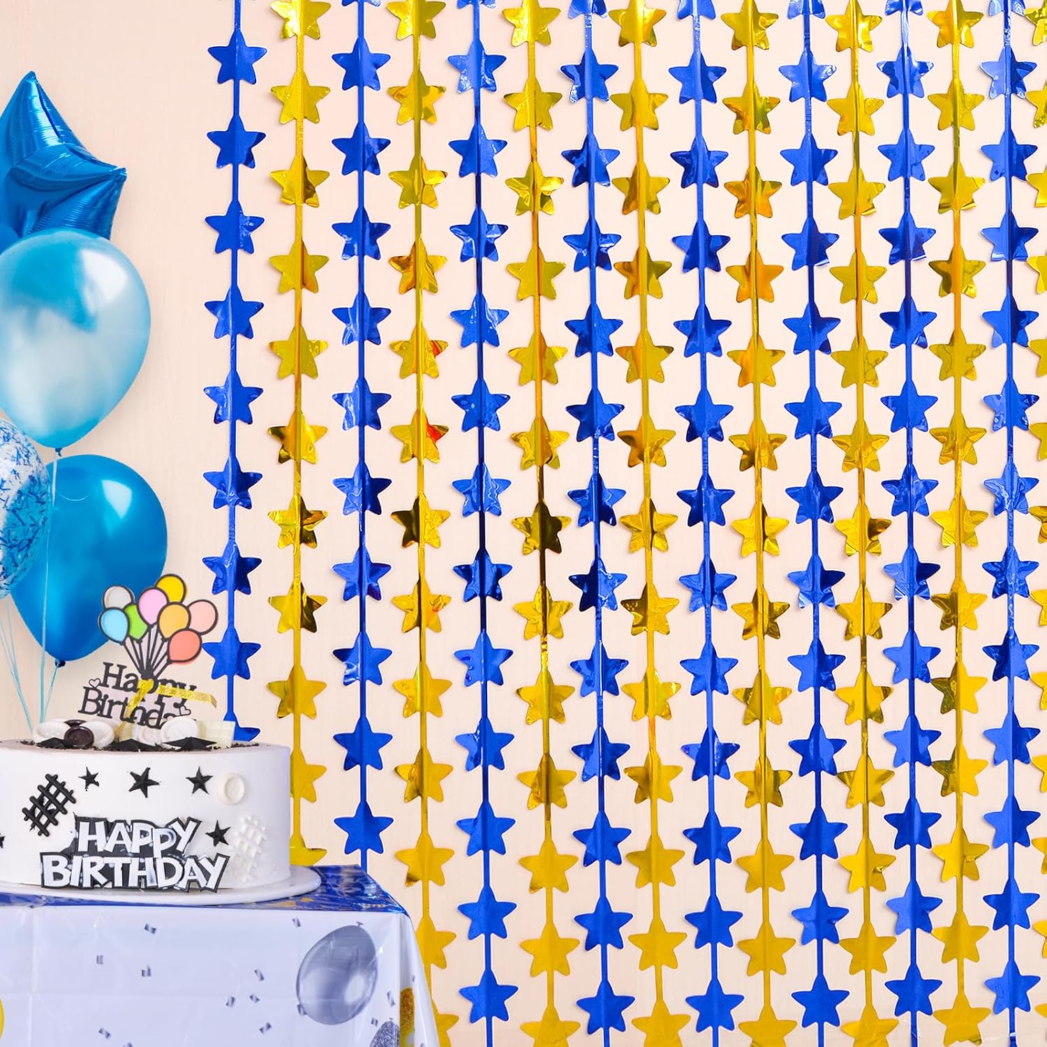 - ๐ใ TINSEL MATERIAL ใ: These blue and gold star metallic foil fringe curtains are made of tinsel. They are lightweight and durable fringe curtains. These high-quality fringe curtains are tough, unbreakable, and can be used for a long time.