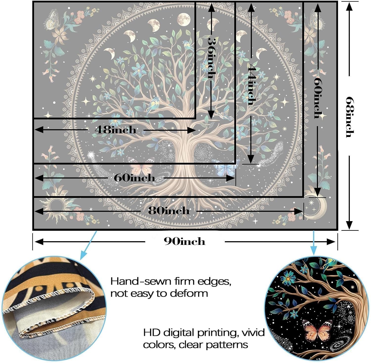 - Elegant Tree of Life Design: This tapestry features a beautifully detailed Tree of Life at the center, surrounded by celestial elements such as the moon, stars, and butterflies. The intricate design adds a spiritual and serene ambiance to any room, perfect for meditation spaces, bedrooms, or living rooms.