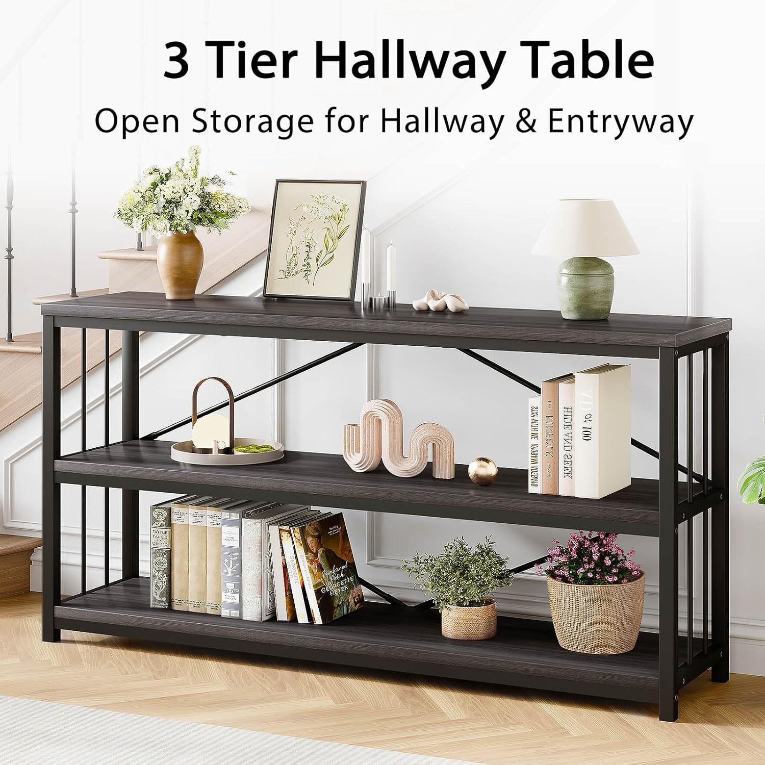 LVB 3-Tier Rustic Console Table, Extra Long Entryway Table with Storage, Industrial Skinny Wood Metal Sofa Table with Shelf, Modern Narrow Hallway Table for Foyer Living Room Bedroom, Dark Gray, 70 In