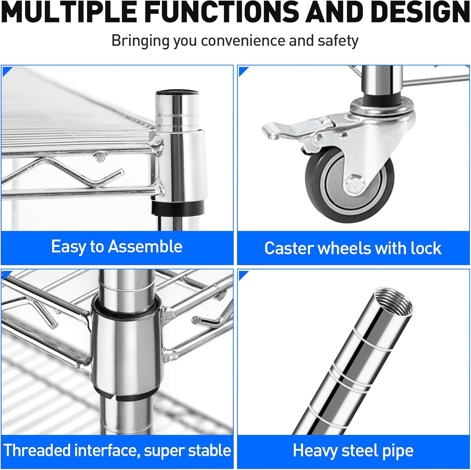 - Heavy Duty Commercial Grade Steel: The metal wire shelving is solid metal construction with a chrome finish that is built to last. Waterproof and moisture-proof, it is very suitable for industrial environments such as workshops, garages, warehouses, etc. Wire rack shelving can hold up to 600 lbs per tier for a total maximum load capacity of 2400 lbs