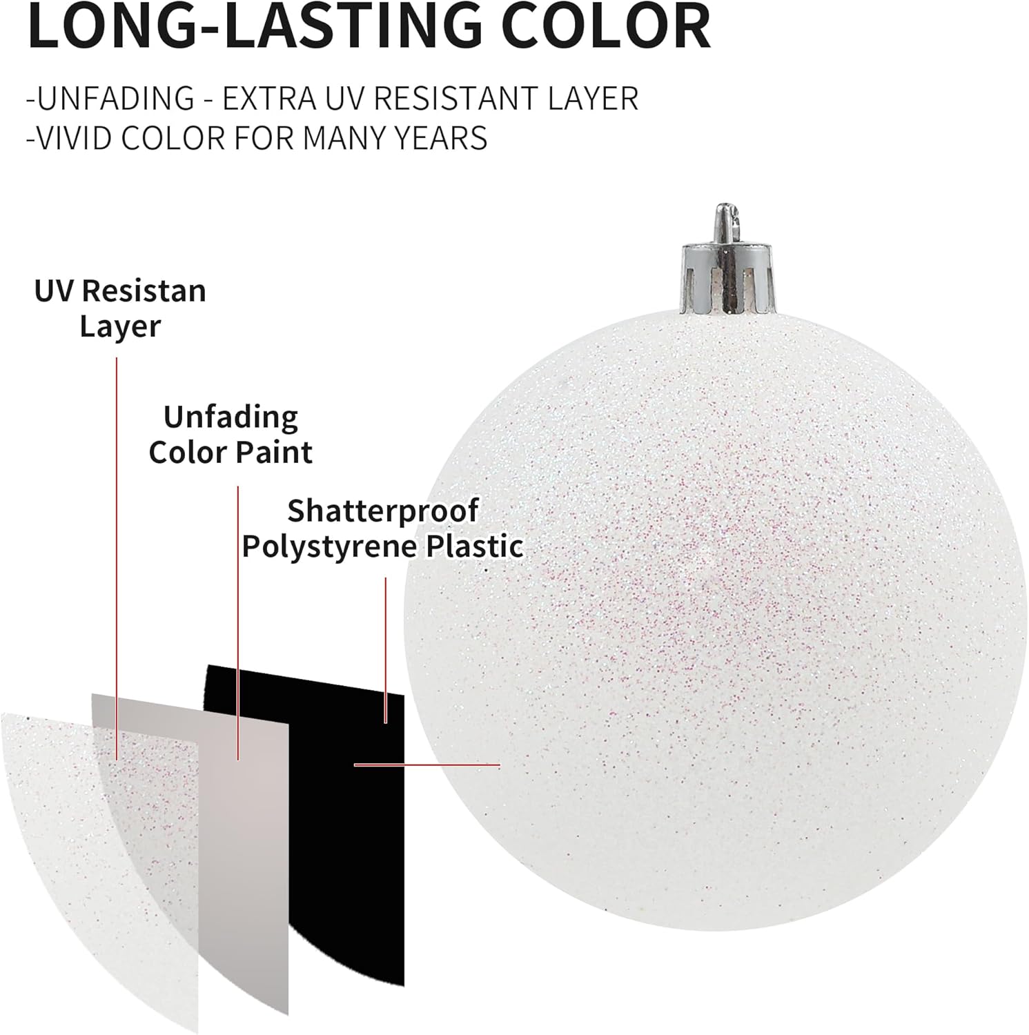- Premium Quality - Crafted from thick and durable material, all our Christmas balls are made to last. Each ornament includes a high-quality plastic hanger to ensure they stay vibrant and shiny throughout the holiday season. Uv protection, indoor and outdoor use.
