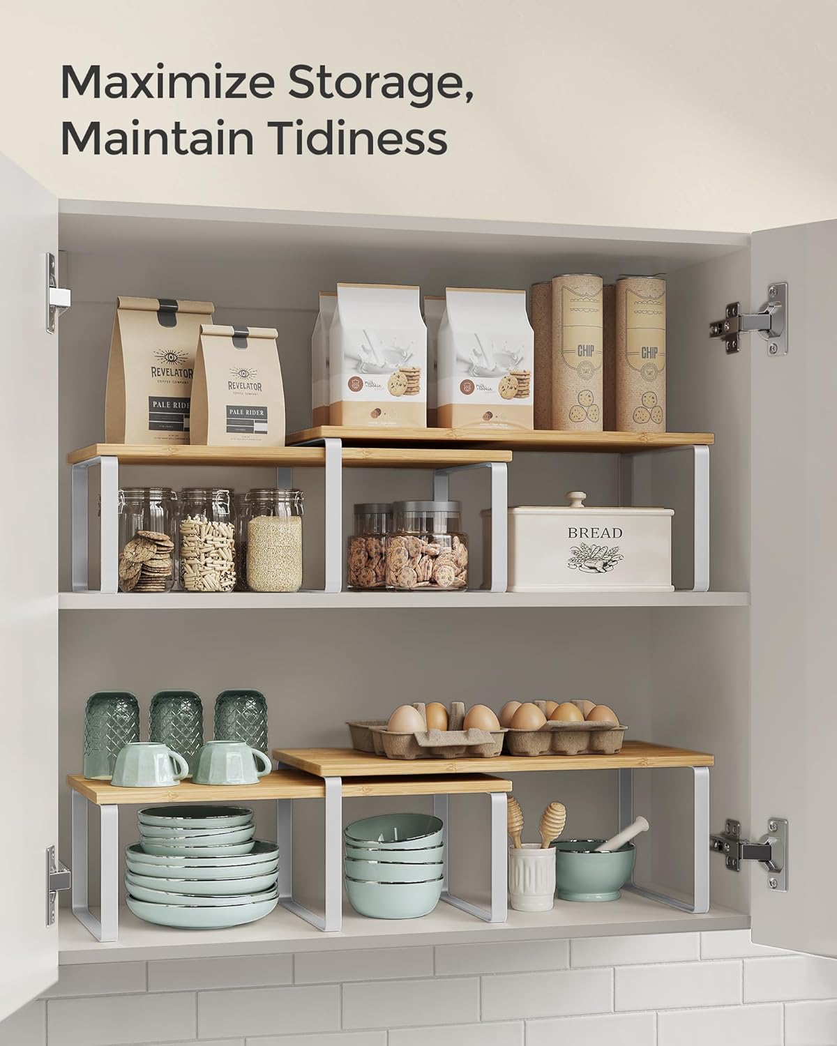 SONGMICS Cabinet Organizer Shelf, Set of 2 Kitchen Counter Shelves, Kitchen Storage, Spice Rack, Stackable, Expandable, Metal and Engineered Wood, Cloud White and Natural Beige UKCS200W01