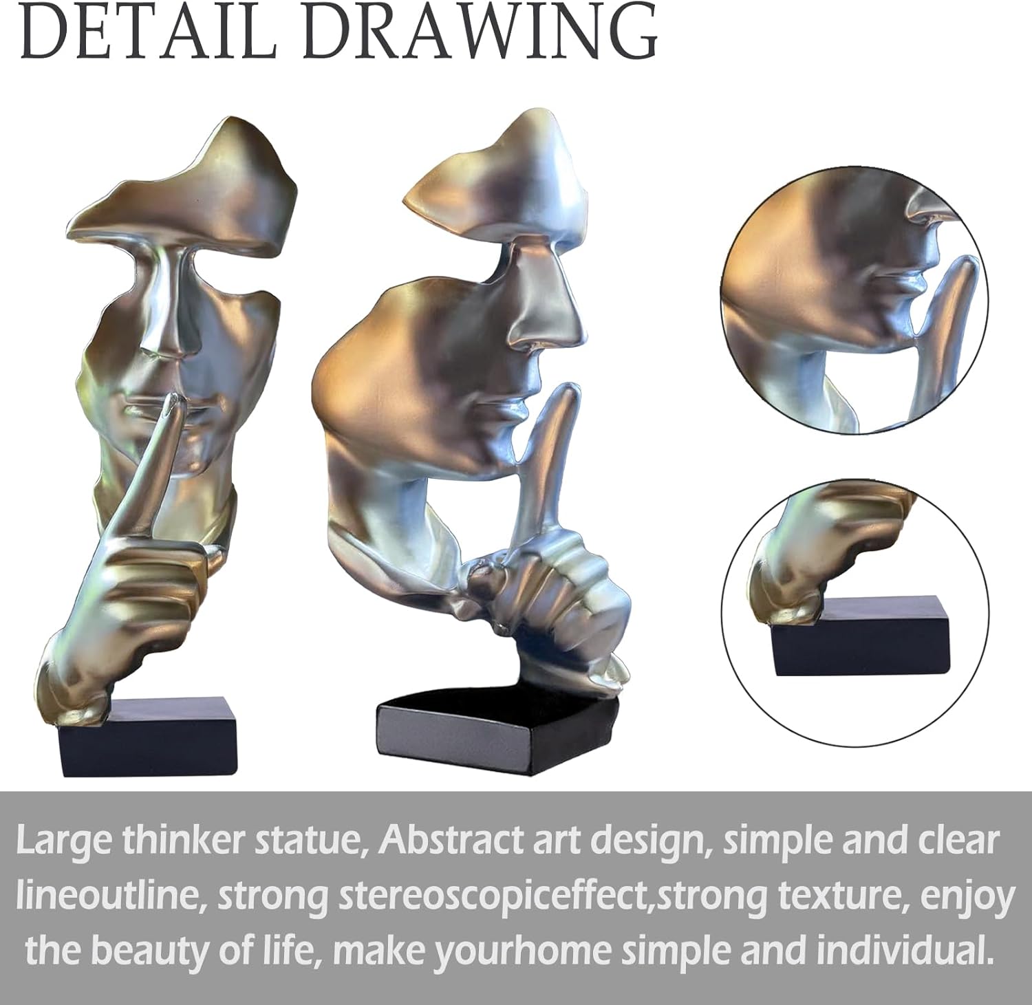 aboxoo Abstract Statues Silence is Gold Decorative Objects,Modern and Simple Resin Figurine,Desk Decoration for Office Home Piano Deco(Large Silver)