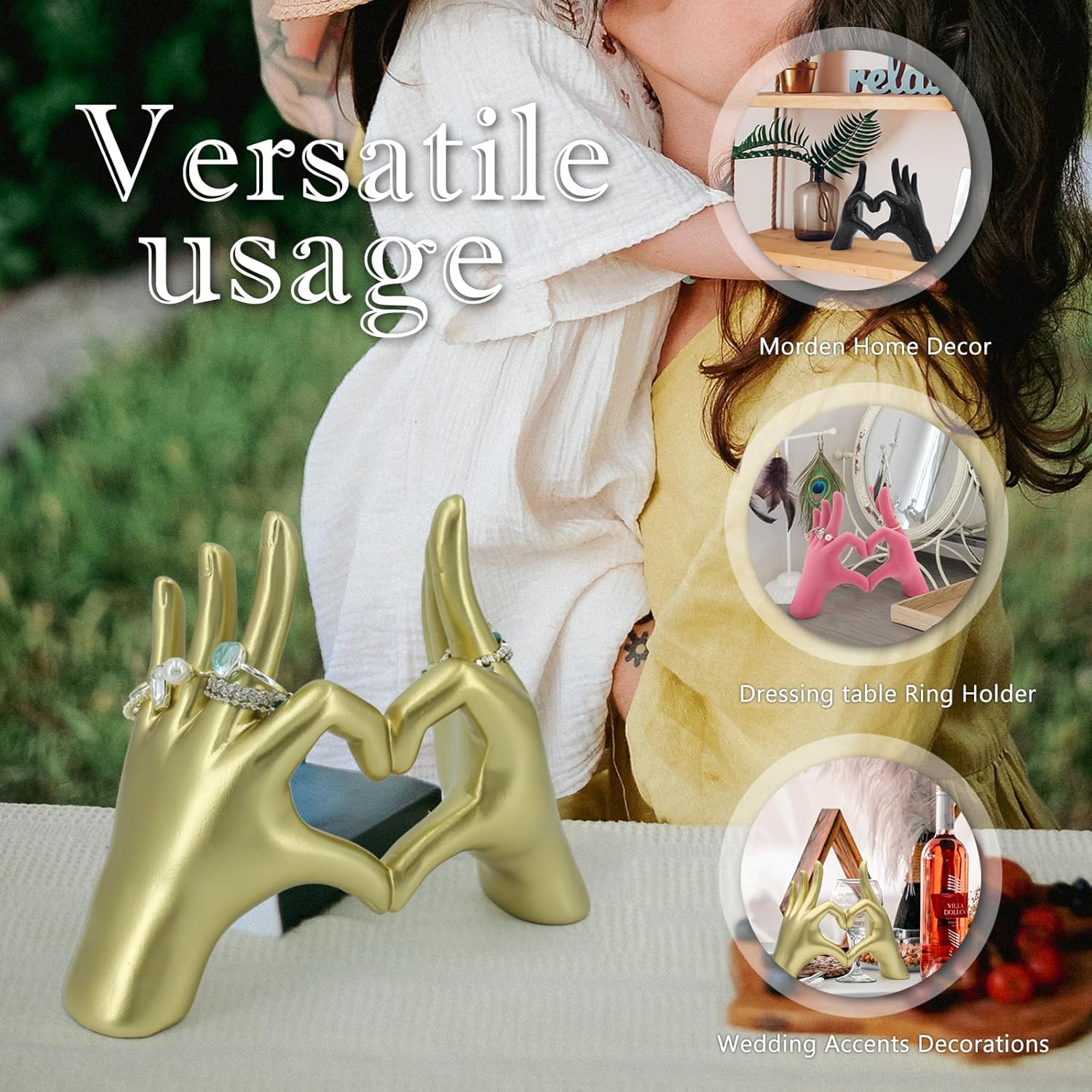 - I love you hand sculpture:The gold heart hand ring holder makes a perfect present for jewelry enthusiasts girl, collectors, Mothers Day presents for Mom, or anyone who appreciates exquisite craftsmanship. Its unique design and practical functionality will impress and delight recipients on birthdays, anniversaries, Valentine's Day decor,or other special occasions. This display stand not only showcases rings but also symbolizes love and warmth, making it a thoughtful and heartfelt present
