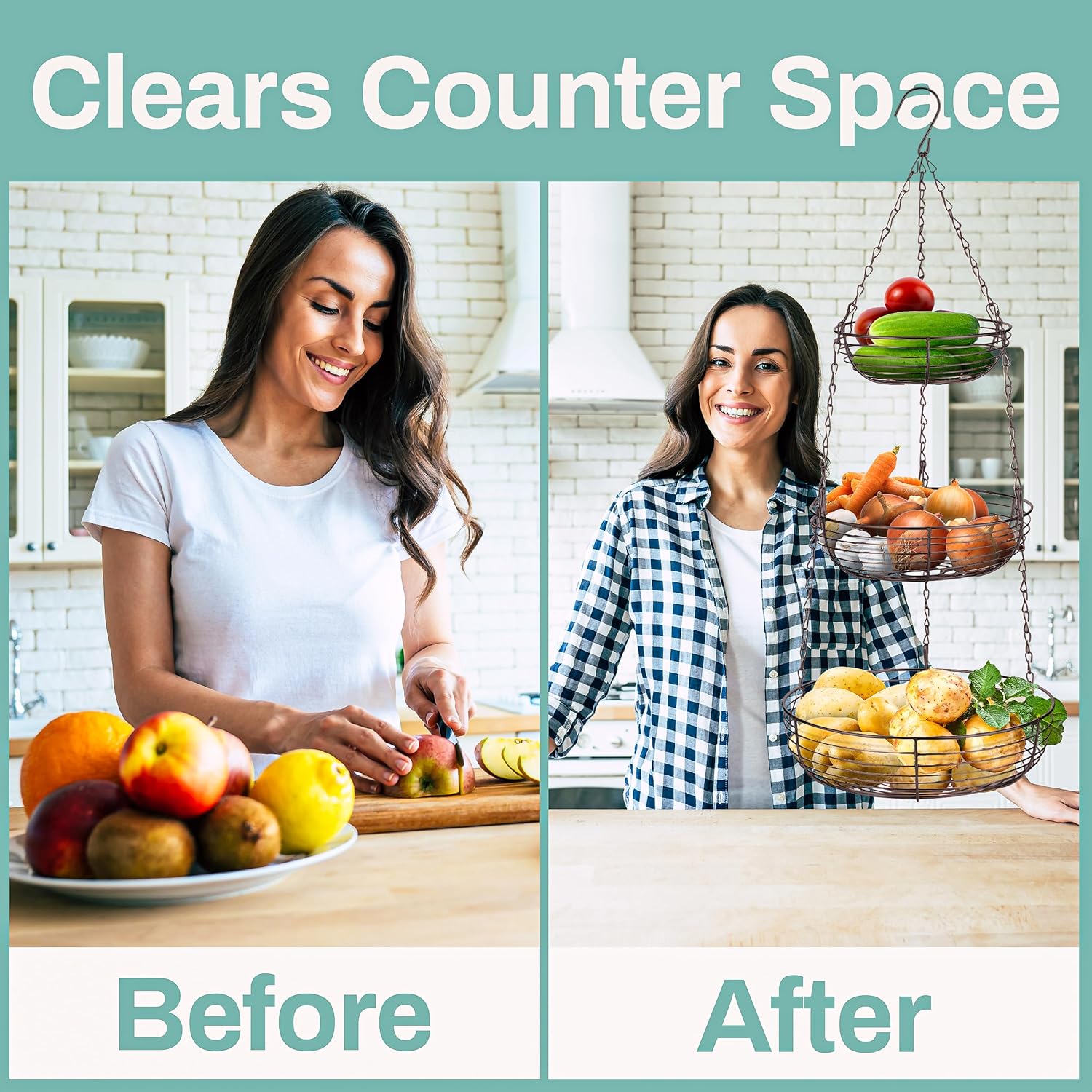 Home Intuition 3-Tier Hanging Fruit Produce Basket Heavy Duty Wire with 2 Metal Ceiling Hooks, Round, Bronze