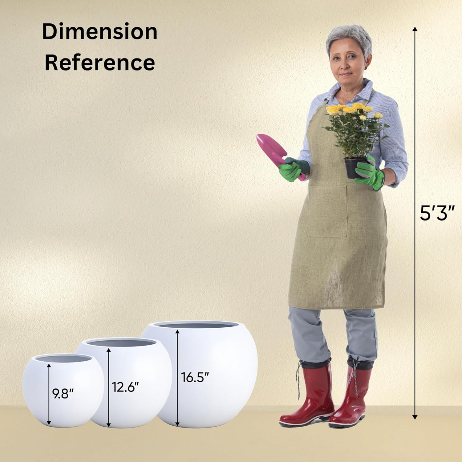 - PRODUCT DIMENSIONS: Carefully review the planter dimensions, especially the pot opening, to ensure they meet the needs of your project. Proper sizing is essential for accommodating your plants and achieving the desired aesthetic and functionality. SMALL PLANTER MEASURES: 10-inch height x 13-inch diameter, pot opening 8 inches MEDIUM PLANTER MEASURES: 13.5-inch height x 17-inch diameter, pot opening 12 inches LARGE PLANTER MEASURES: 17-inch height x 21-inch diameter, pot opening 14.4 inches