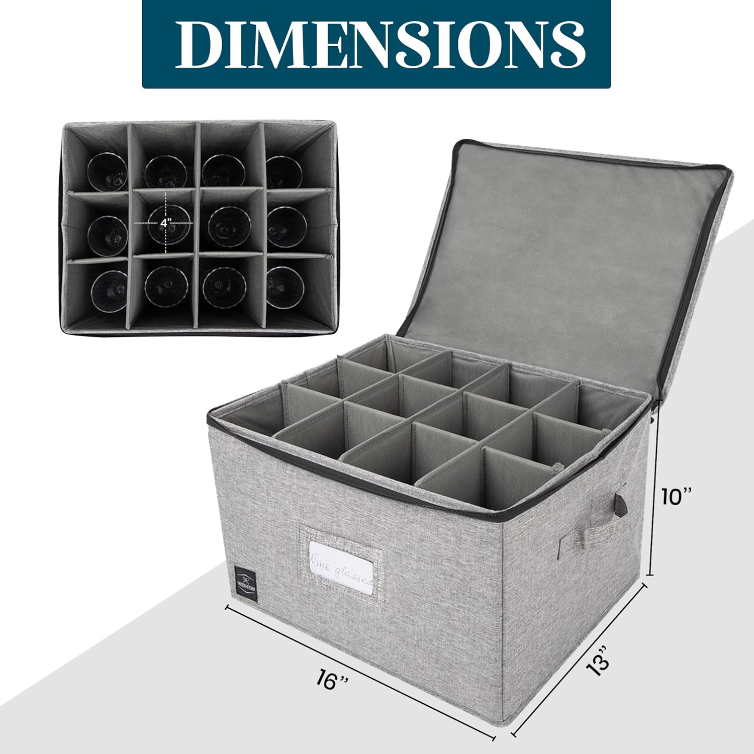 - STACKABLE GLASSWARE STORAGE CHEST: Designed for convenience and protection, this stackable glassware storage chest holds up to 12 wine/stemware glasses. This storage case is 16" W X 13" D X 10" H. Each interior compartment measures 4" X 4" and is equipped with removable padded dividers to ensure secure storage and safeguards against chipping or scratching. Glassware shorter than 10”, including beer glasses, can also be transported and stored in this storage box.