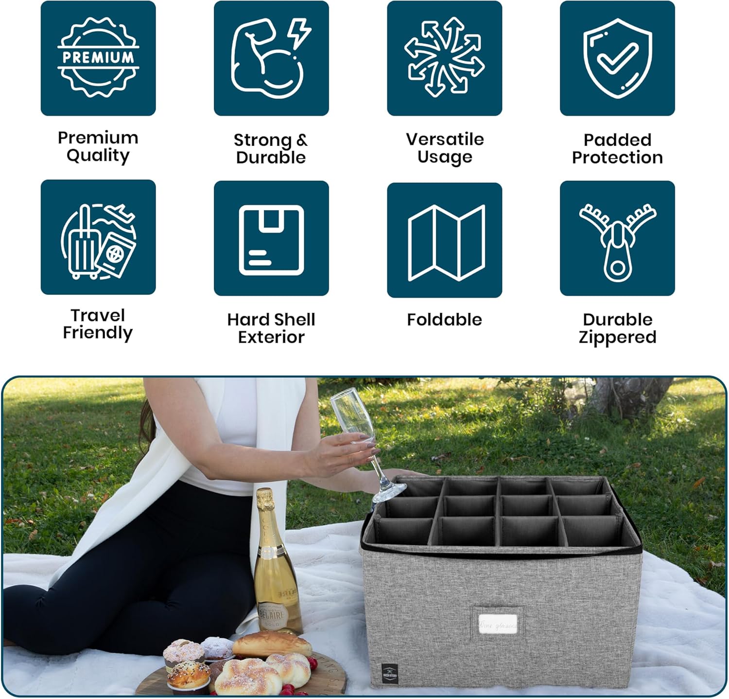 Wine Glass Storage, Holds 12 Stemware Glasses, Stackable, Fully-Padded Inside with Hard Top and Sides (Grey)