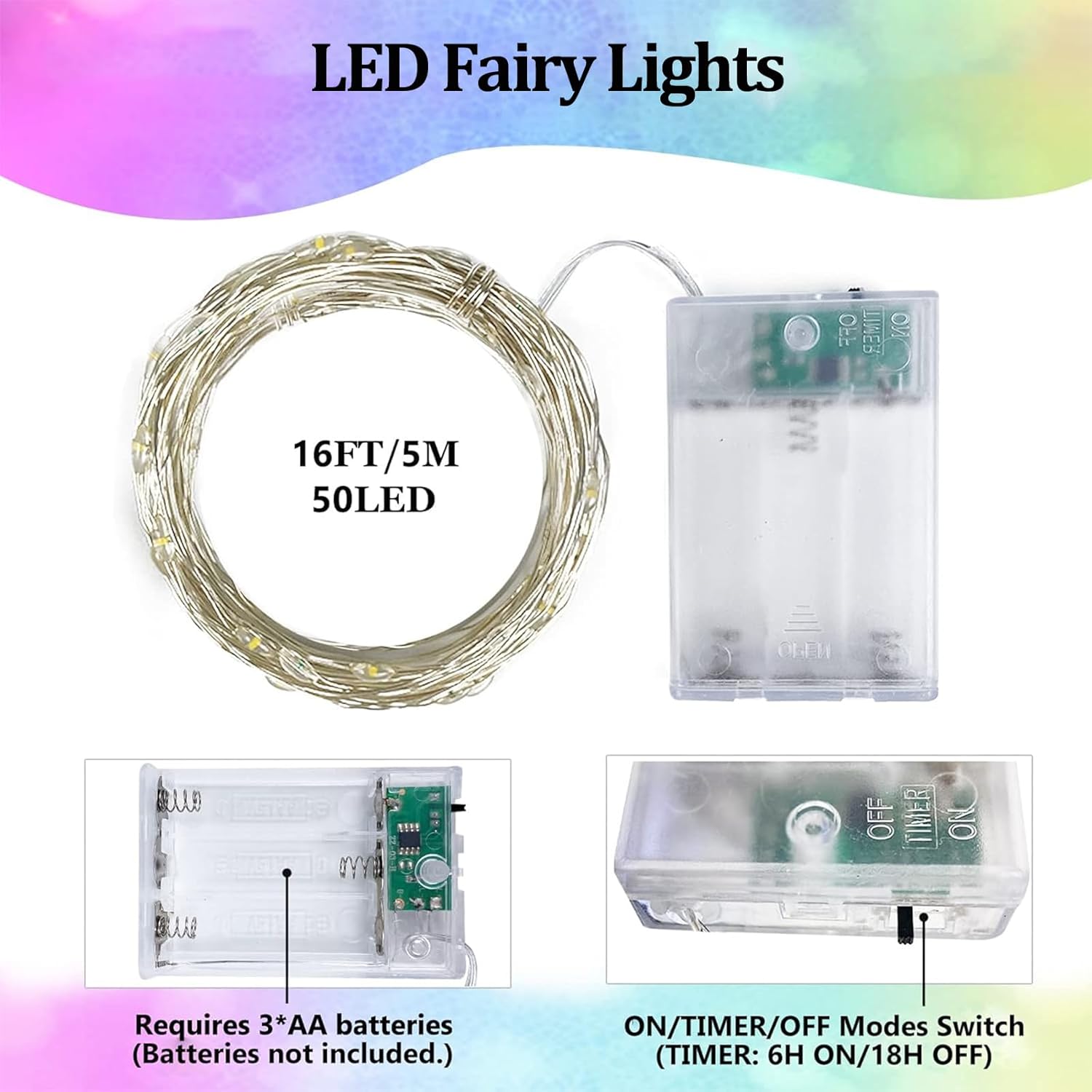 - Fairy Lights with Timer: When the switch is set to "TIMER" on the battery case, the fairy lights will automatically stay on for 6 hours and turn off for 18 hours, repeating the cycle daily as long as the batteries have power. Enjoy effortless, hands-free operation while saving energy