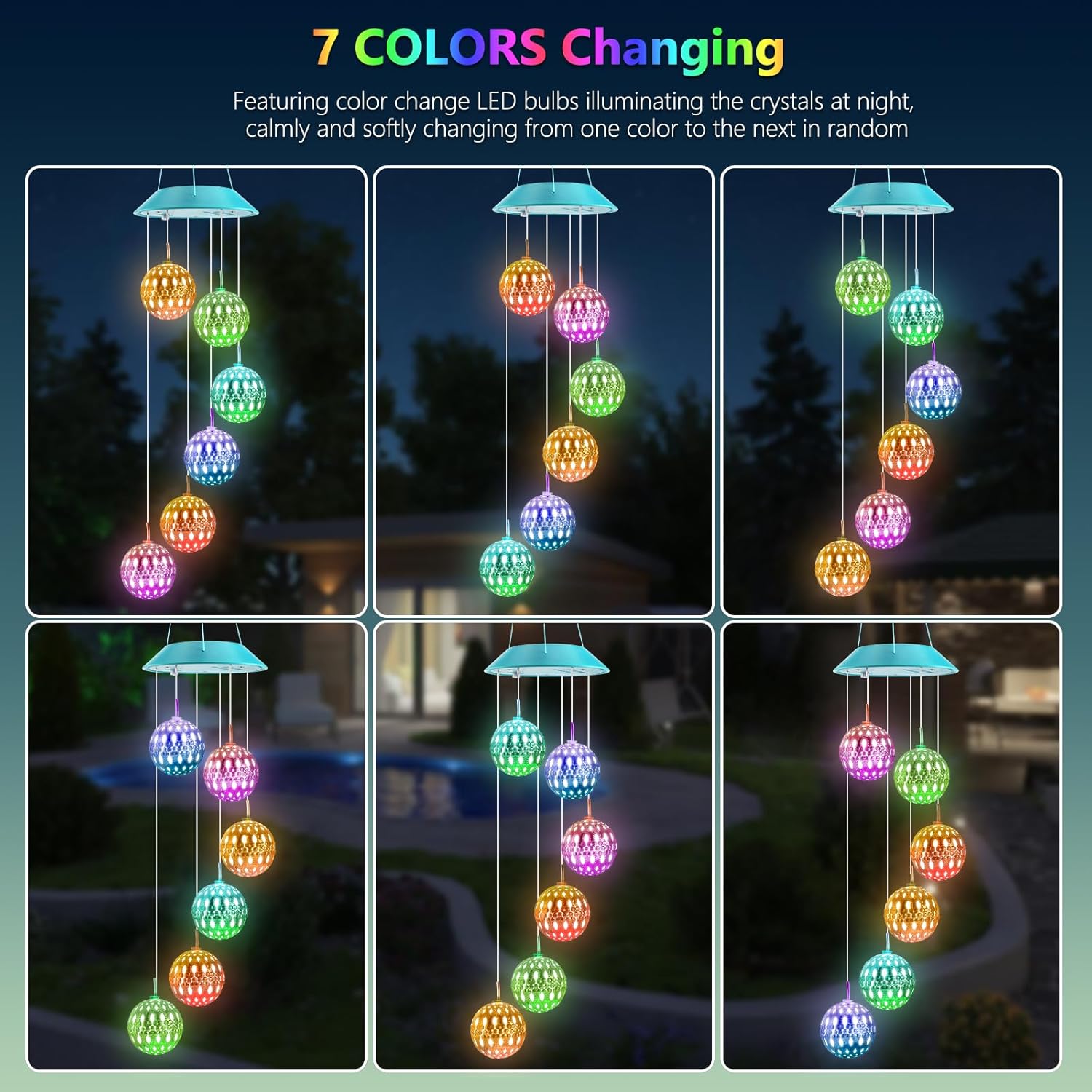 - 【7 Colors Changing Decorative Mobile Lights】 The solar ball decorative lights change color alternatively between red, green, orange, blue, yellow, purple and white, one color gradually transitions into another creating a surreal visual effect, adds a charming display of lights and make your surroundings look dreamy and magical. This solar wind chimes will definitely suitable for your bedroom, patio, balcony, window or garden decoration.