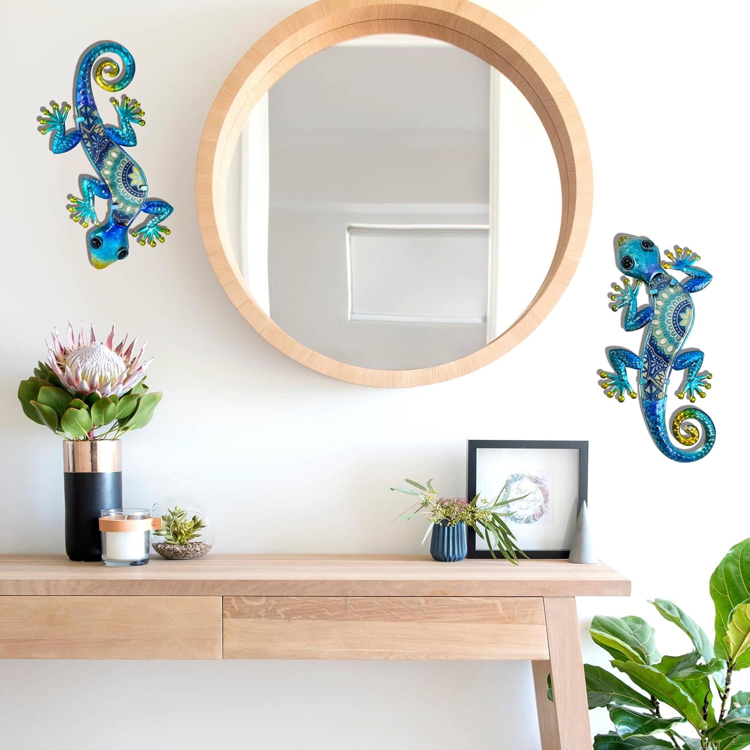 HONGLAND Metal Gecko Wall Art 2Pcs Outdoor Wall Decor Lizard Metal Hanging Wall Decoration Glass Sculpture for Garden Yard Patio Fence Home (Blue)