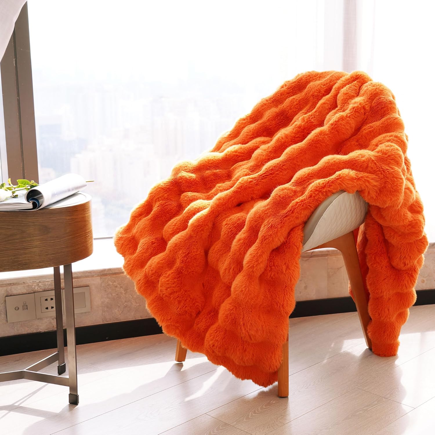 - 【Exquisite carft make the bubble stable】Our plush fuzzy furry rabbit faux fur throw blankets are well made in every process. We gurantee its skin-firendly and eco-friendly due to premium microfiber selection. High-end weaving ensure the durable and fairly uniform of each bubble. Neat stitching with minky fleece velvet is not only a brilliant match,but also provide extremely soft and warm. Various chic color adoption decorate the bubble bright and colorful. You can choose the color that suits you best.