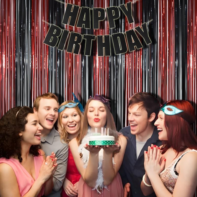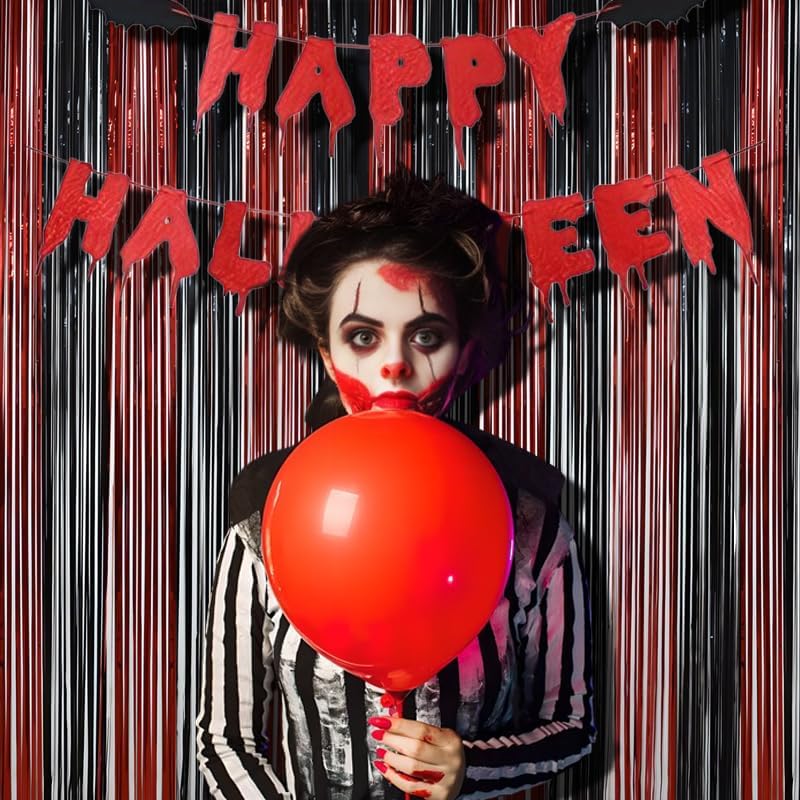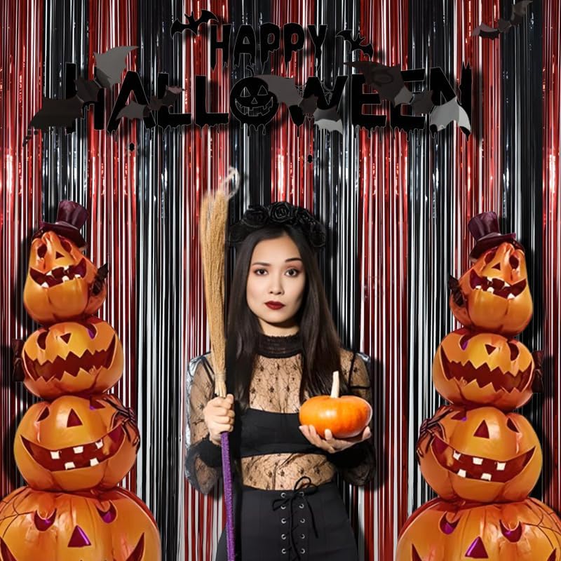BRAVESHINE Tinsel Photo Backdrop Curtains - 2 Pack 3.2x8.2ft Black Red Foil Fringe Streamer Curtain for Halloweens, Lantern, Pumpkin, Home, Indoor or Outdoor Party Supplies Decorations