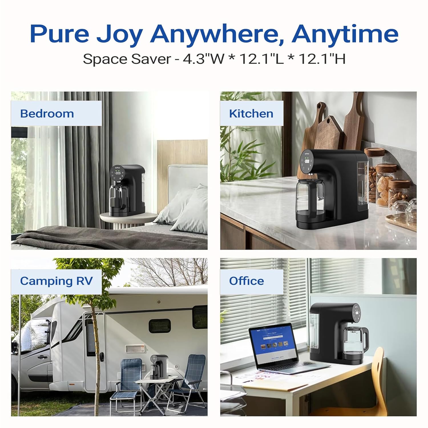 - Portable Countertop Water Purifier: The compact 4.3 × 12.1 × 12.1" design fits any space. No installation required—its sleek design combines style and convenience, making it perfect for home or office use