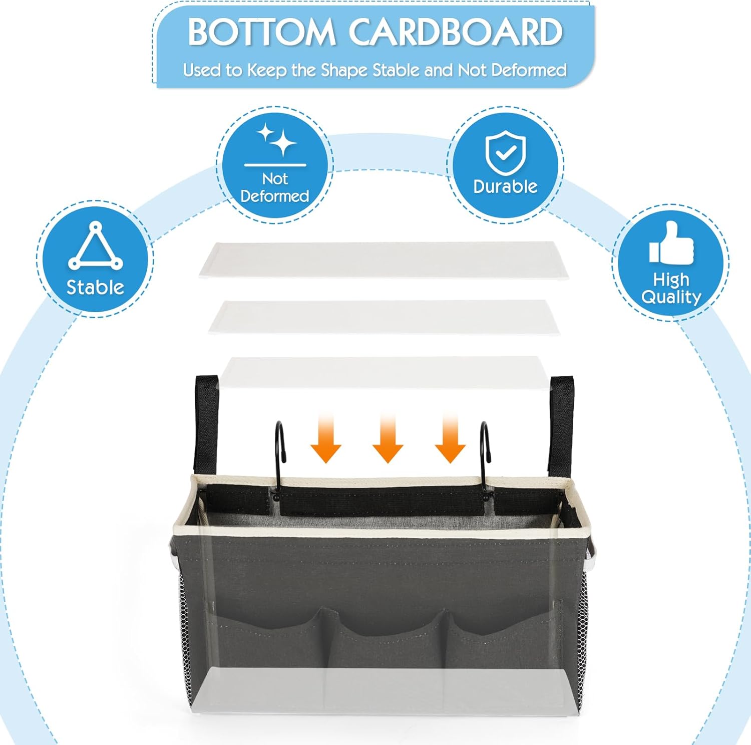 - 【Strong Bearing Capacity】In addition to the metal hook, the bedside organizer also added adjustable straps on both sides to help the bedside caddy to be additionally fixed in place, bottom cardboard added to hold basket shape, enduring enough to bear heavy weight and prevent sagging.