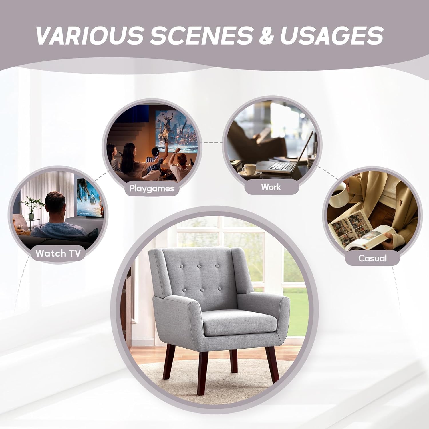 HUIMO Accent Chair Living Room Chair, Upholstered Button Tufted Armchair, Linen Fabric Sofa Chairs for Bedroom, Living Room, Mid Century Modern Comfy Reading Chair (Light Grey)