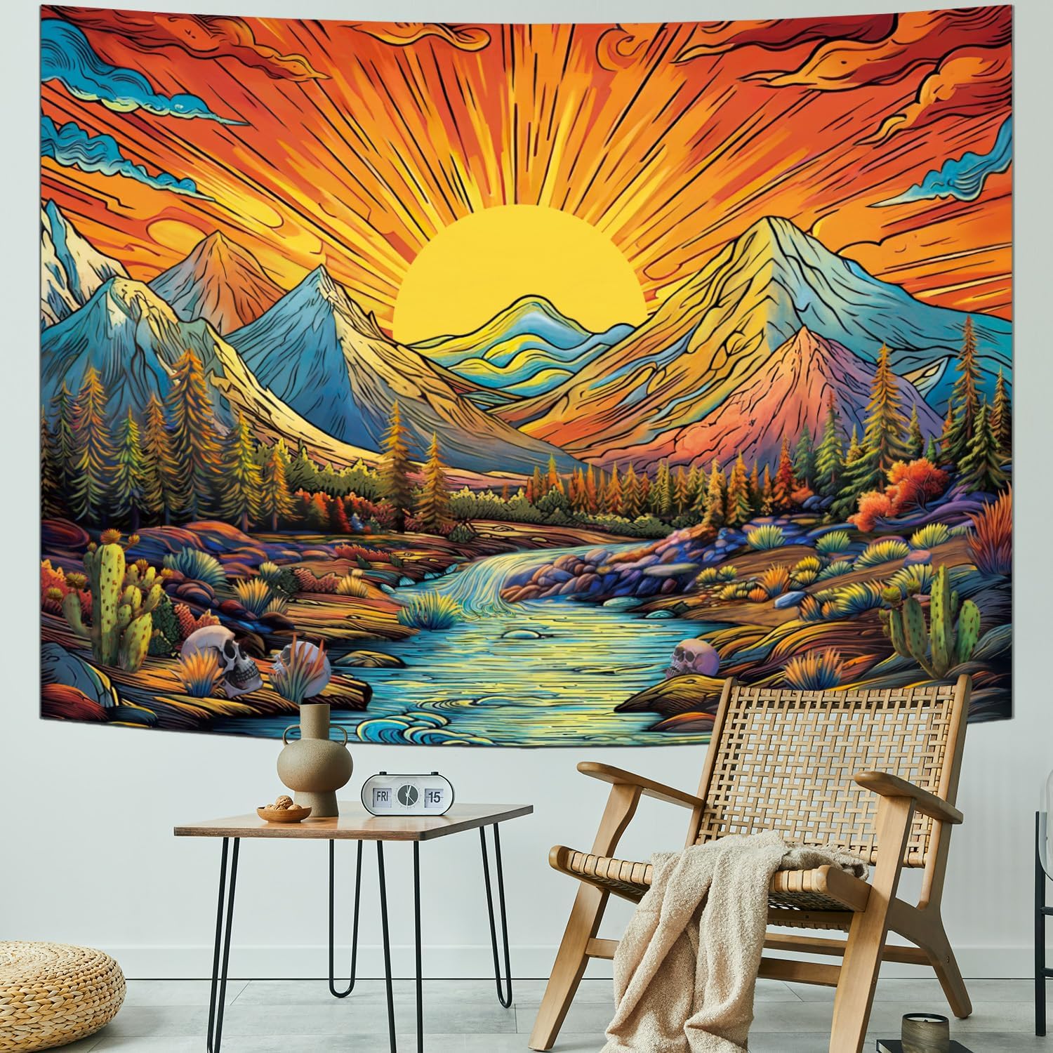 Serborlur Boho Sun Mountain Tapestry Trippy Forest Tree Tapestry Vintage Aesthetic Magic River Tapestries Nature Landscape Wall Hanging for Bedroom Home Decor (51.2"×59.1")