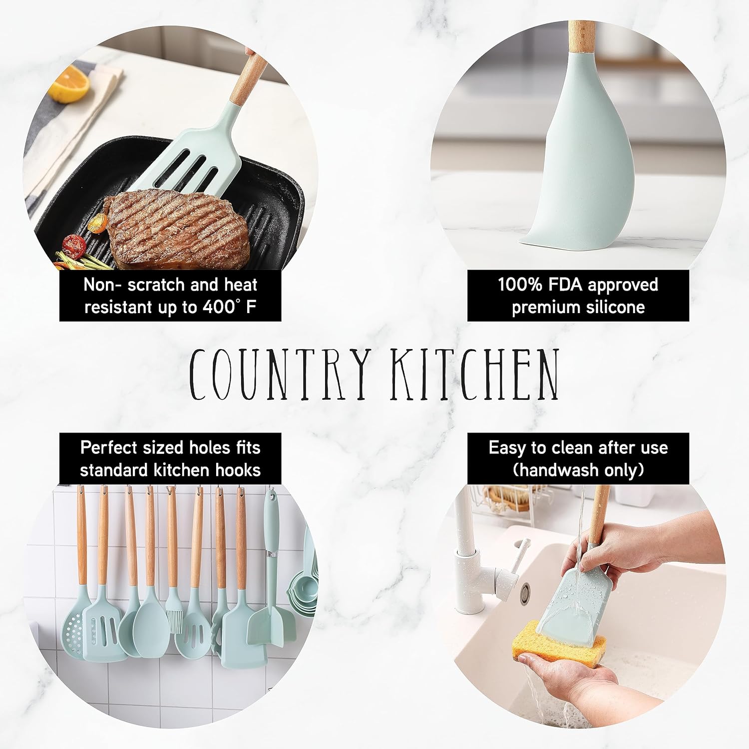 Country Kitchen Non Stick Silicone Utensil Set with Rounded Wood Handles for Cooking and Baking, 38 Piece Set, Mint