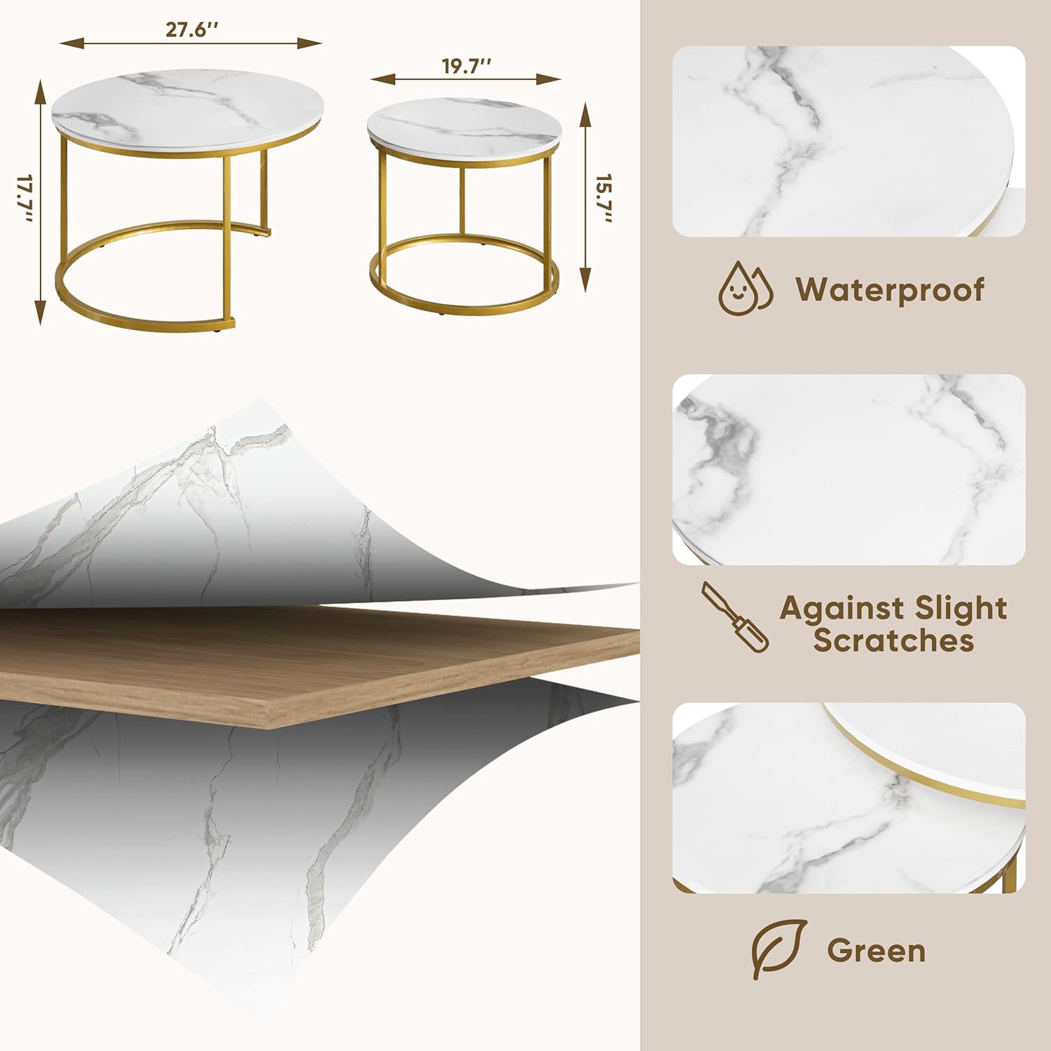 - 【Beautiful and practical】This round nesting table for the living room features a modern design style with elegant curves and simple lines. The gold metal base and marble grain pattern table top blend seamlessly with modern and industrial design while maintaining a rustic and minimalist aesthetic.