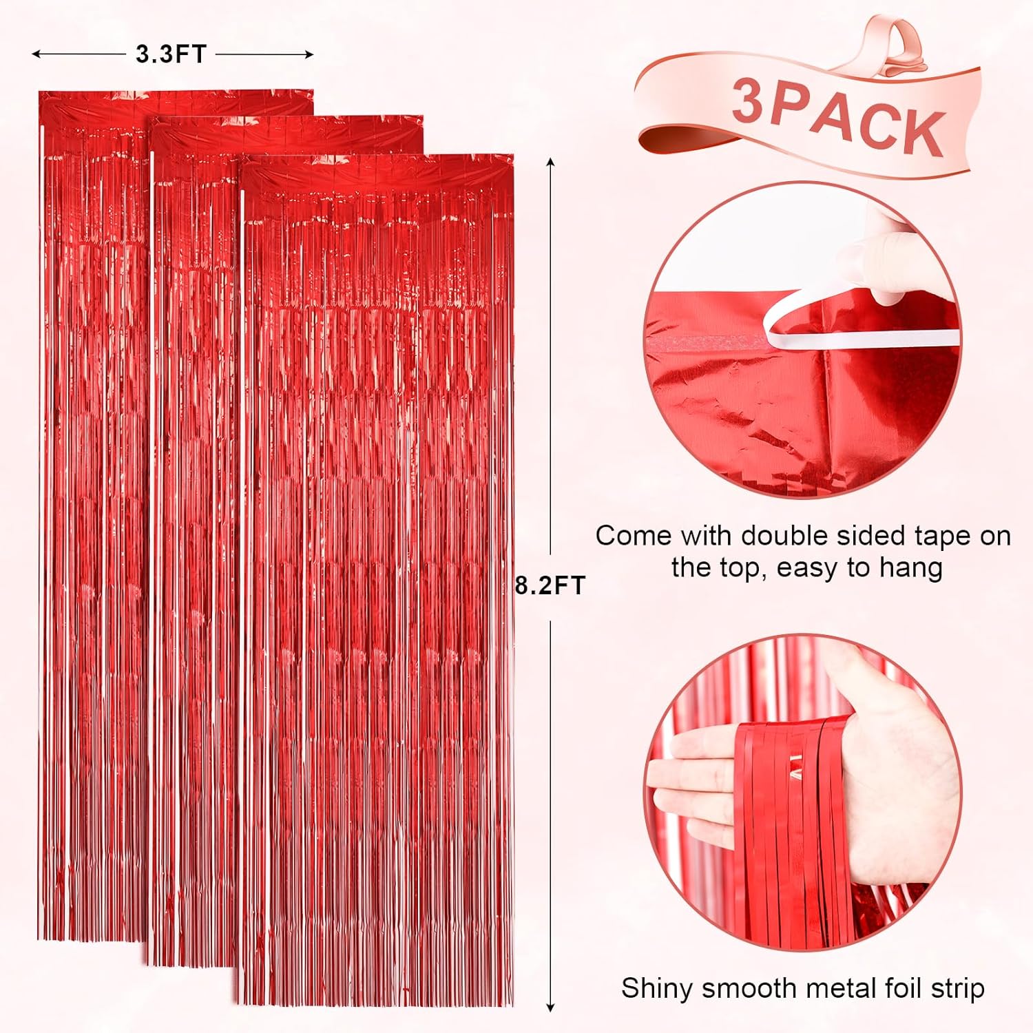 3 Pack 3.3 x 8.2 ft Laser Red Foil Fringe Backdrop Curtains, Tinsel Streamers Birthday Party Decorations, Fringe Backdrop for Graduation, Baby Shower, Gender Reveal, Disco Party