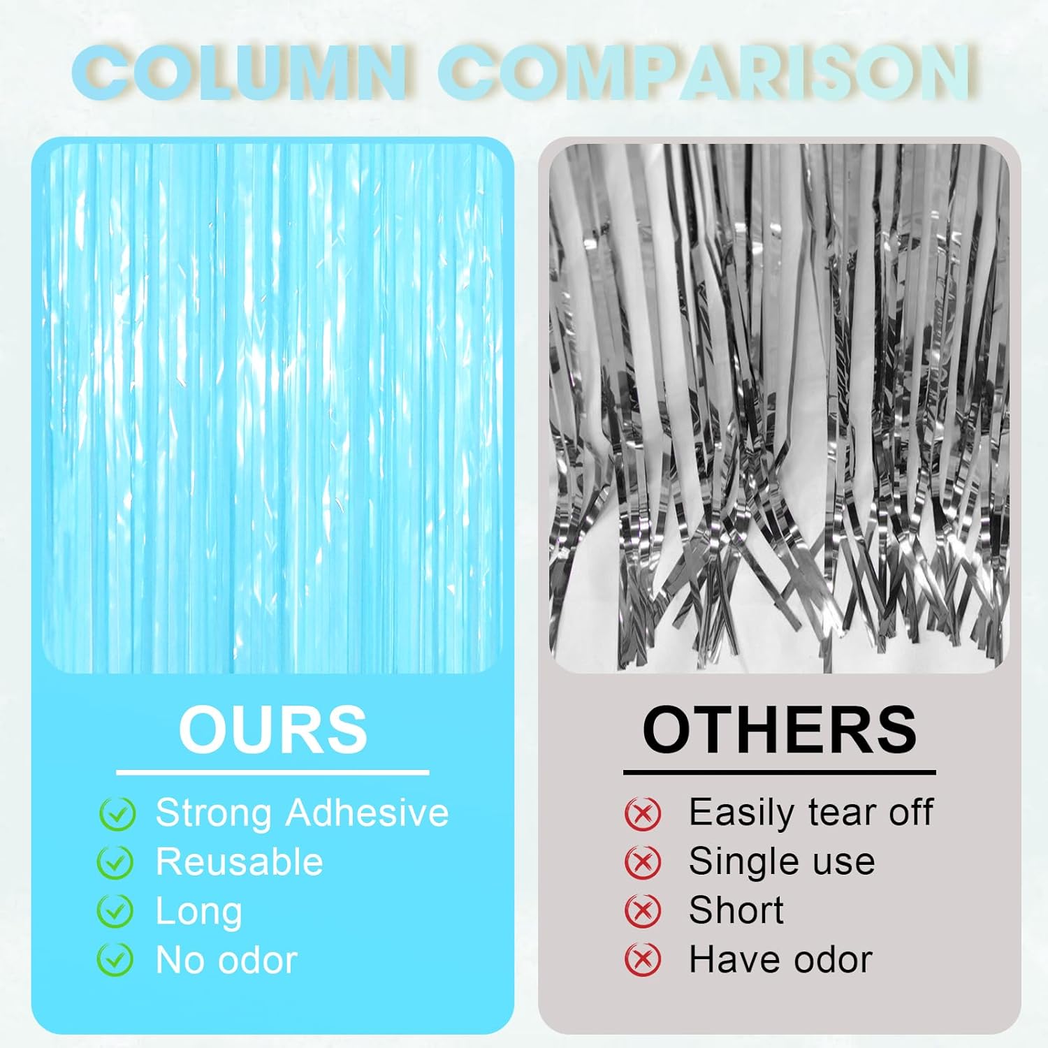 - Package Included: 3 packs of foil fringe curtains, the size of the foil curtain is 3.3*8.2 ft. It's long enough to fit any occasion. Please do not stick the foil curtain on uneven or stained walls to prevent it from falling off
