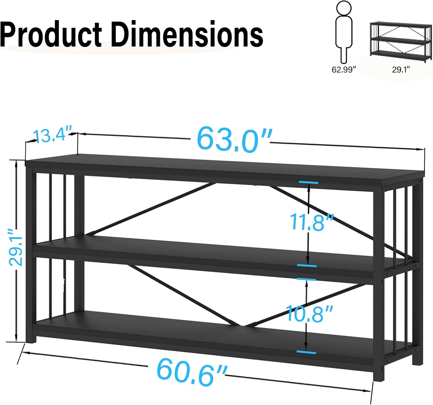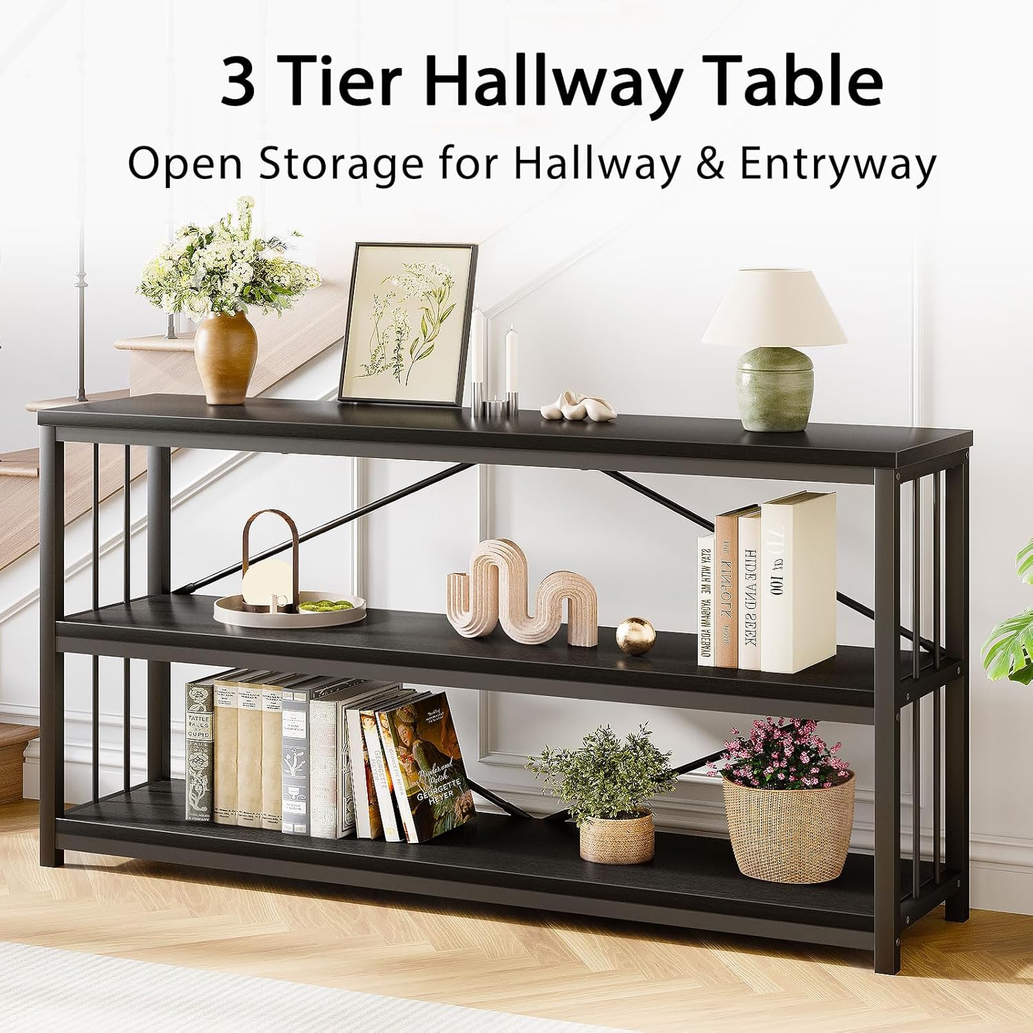 - Timeless Durability: Heavy rectangle metal tube frame ensures sturdiness and years of use, meanwhile thickened high-grade MDF finish can make the 3 tier shelf foyer table bear a weight of 300 pounds. Diamond shaped frame crossbar on the back to strengthen the stability, it never wobbling on the floor.