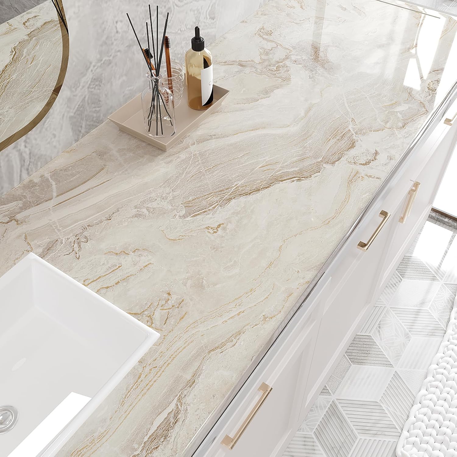 VEELIKE Large Size Marble Contact Paper Peel and Stick Countertops for Kitchen Waterproof Beige Gold Marble Wallpaper for Countertops Walls 32''x118'' Self Adhesive Countertop Vinyl for Bathroom Desk