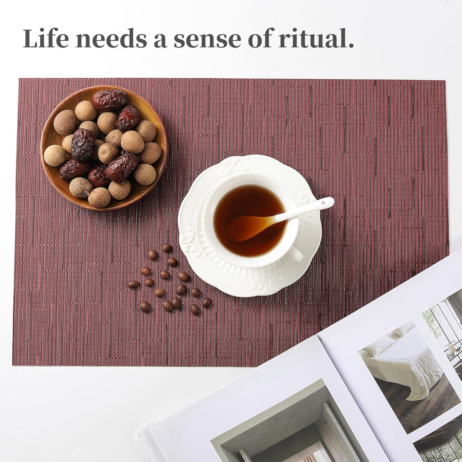 Leetaltree Burgundy Placemats Set of 6 - Heat Resistant Non-Slip Place mats for Dining Table, Washable Durable PVC Vinyl Woven Table Mats(Burgundy, 6)