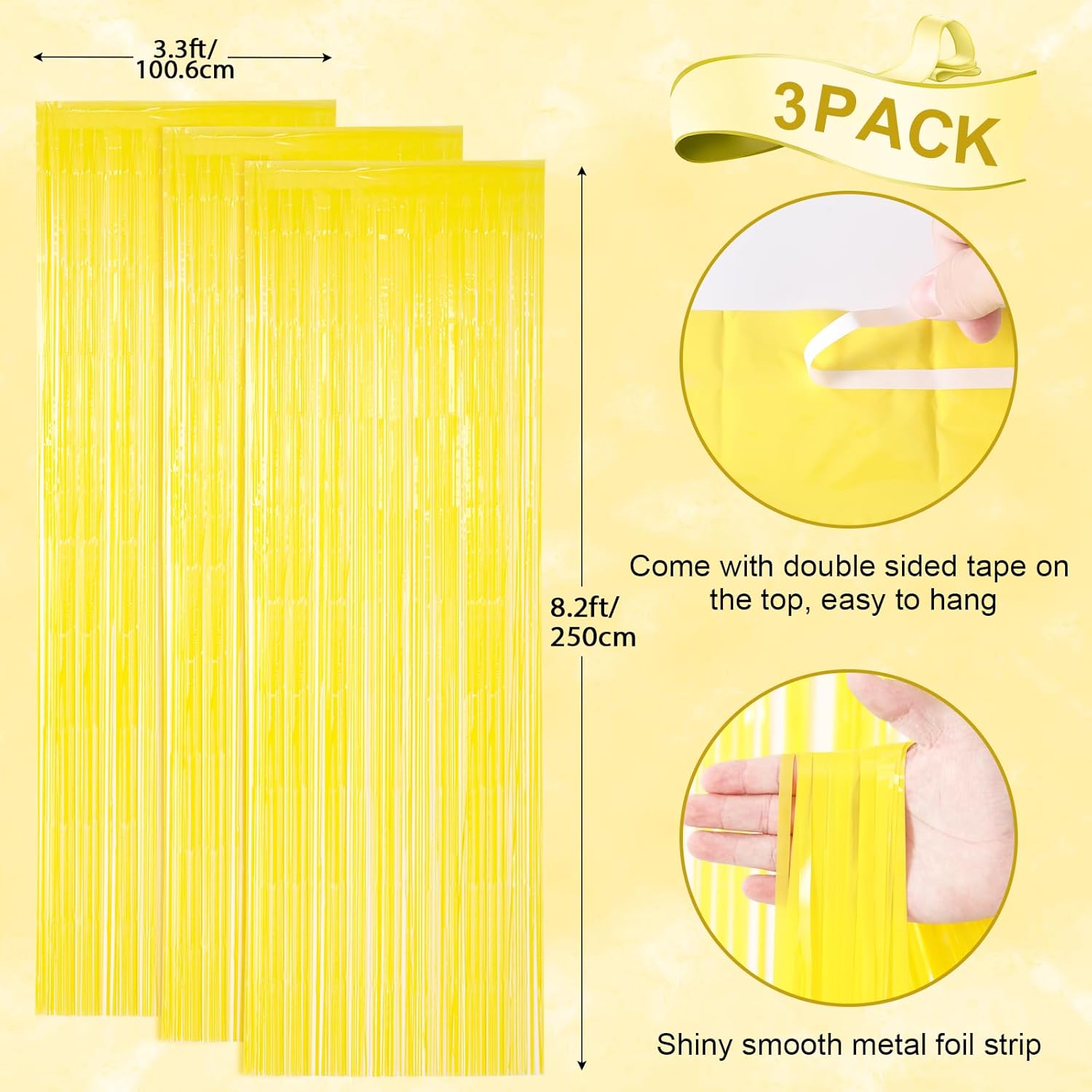 3 Pack 3.3 x 8.2 ft Pastel Yellow Foil Fringe Backdrop Curtains, Tinsel Streamers Birthday Party Decorations, Fringe Backdrop for Graduation, Baby Shower, Gender Reveal, Disco Party
