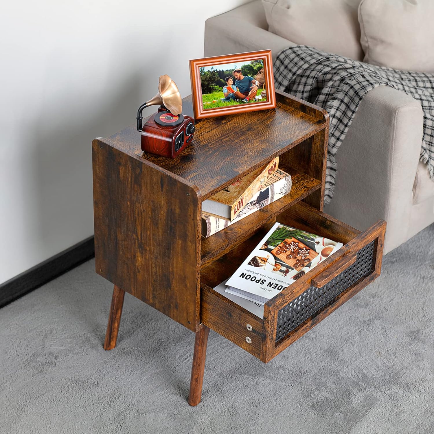 - [Handmade & Use Scenarios] The handmade solid wood legs and drawer handle retain the original grain of the wood. Being a bedside table is not the only role it excels in. It can be placed in the living room, bedroom, office and other small places. It can hold everything you need within reach. Let the charming little rattan side table be a part of your life.