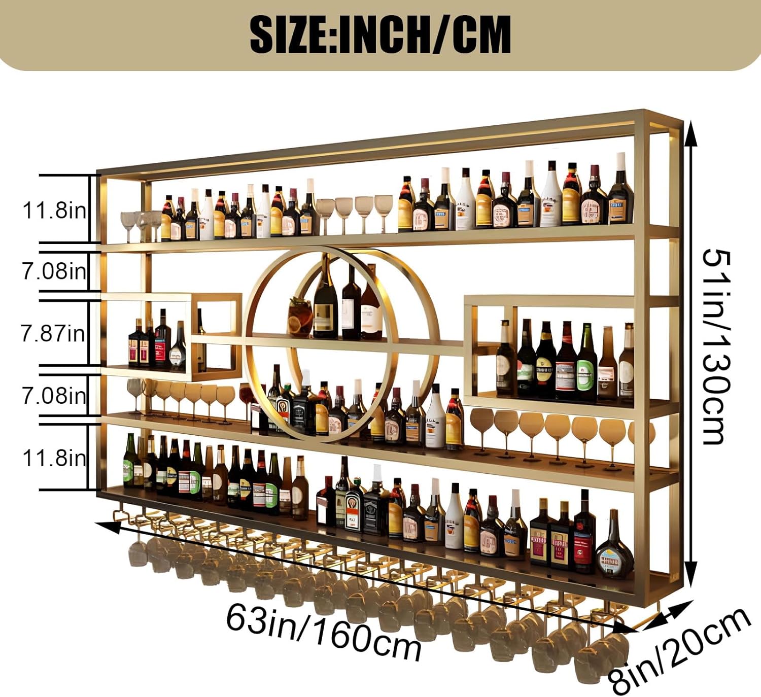 63in Wall Mounted Wine Rack, Modern Metal Wine Bottle and Glass Holder, Iron Display Stand Decorative Wine Rack, for Bar Living Room Dining Room Background (Gold, 63 * 8 * 51INCHES)