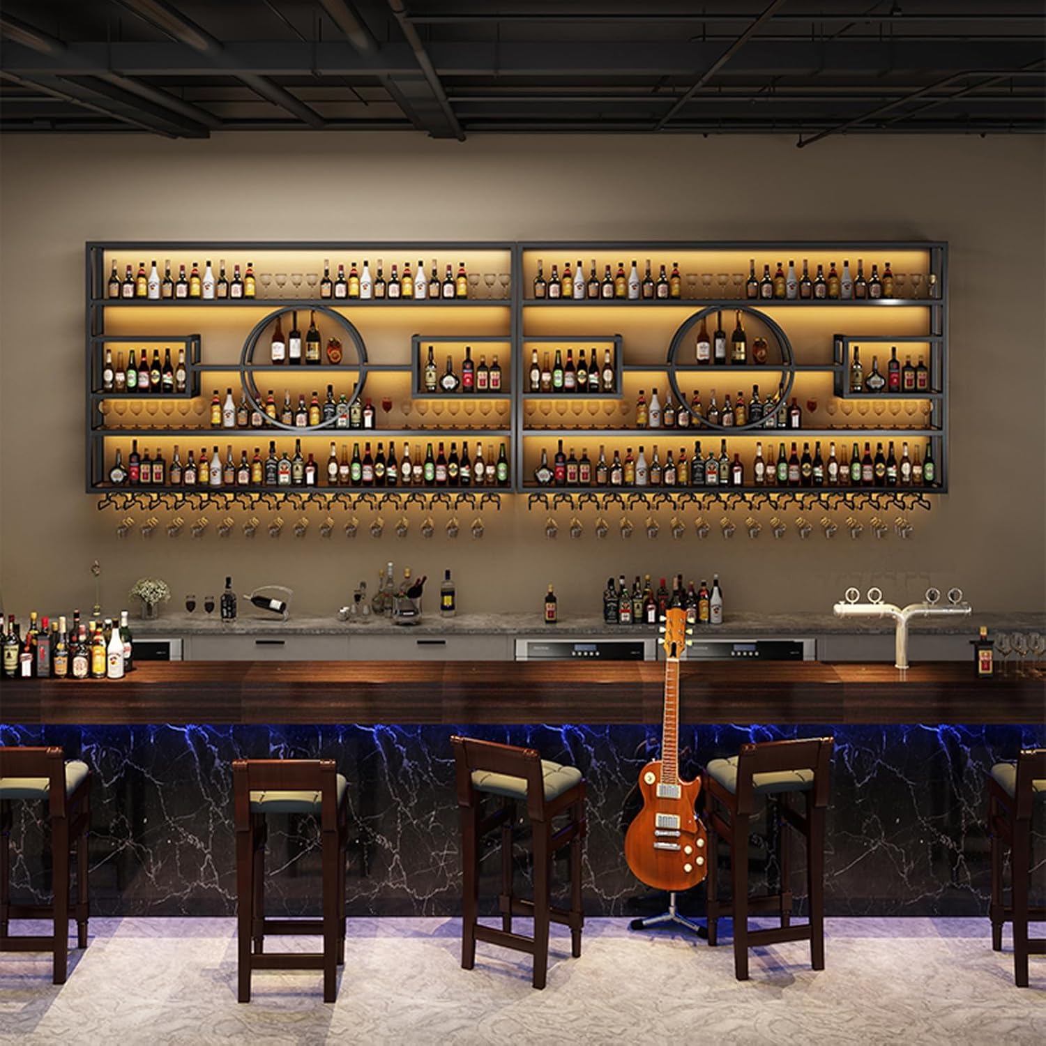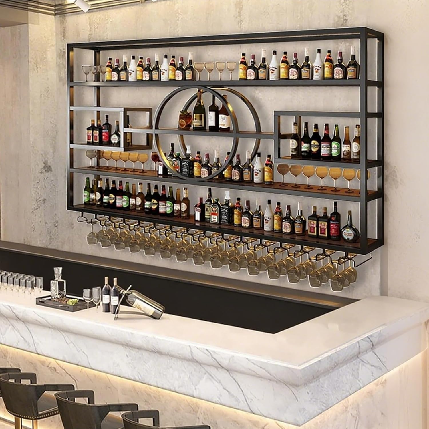 - 【Multi-functional Use】The modern style wine rack can easily match various room styles. No need to worry about having no place to store wine glasses and wine bottles, putting this wine rack on the bar can make the bar space less monotonous. Put it next to the table in the cafe, you can organize spice bottles, wine bottles, green plants and other items. Especially suitable for bars and cafes